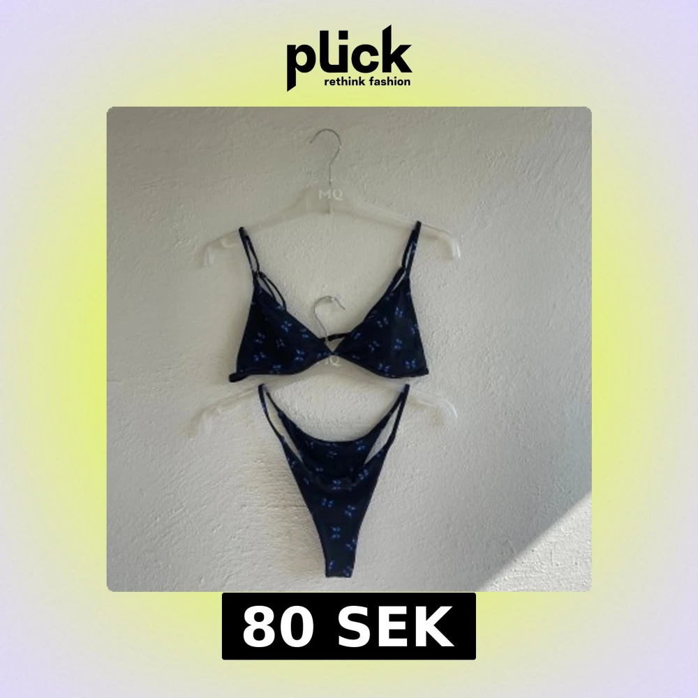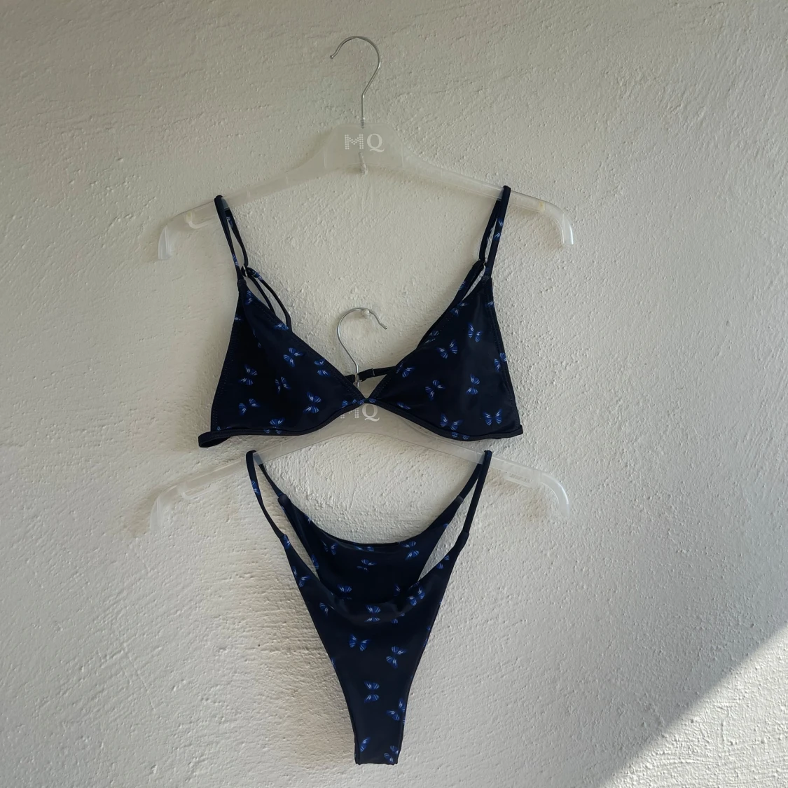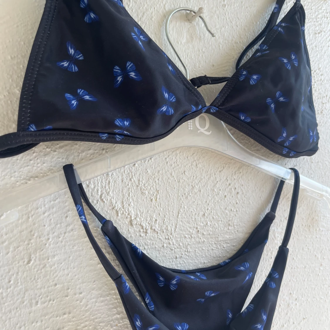Svart bikini med små blå fjärilar. Bikinin har trekantsformad överdel med smala axelband och matchande nederdel.