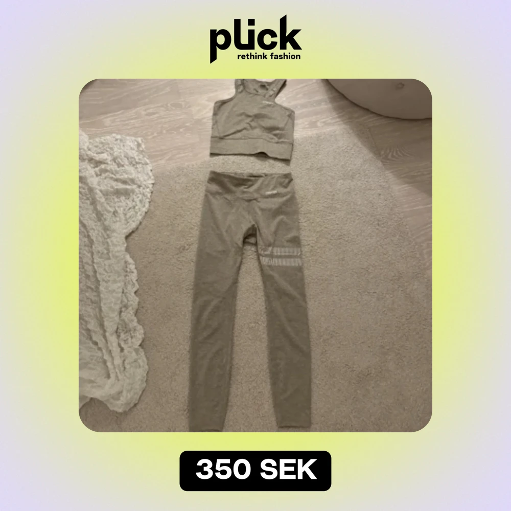 Oanvänt träningsset från Stronger med både tights och topp. Därför i nyskick. Jättefin beige färg med vita detaljer. Nypris för både delarna tillsammans var 1100kr.