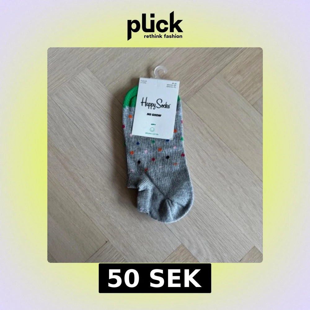 Snygga och bekväma no show-strumpor från Happy Socks i grått med färgglada prickar. Tillverkade av ekologisk bomull och har en grön häl. Perfekta för att hålla sig osynliga i skorna men ändå ge en färgglad touch. Storlek 36-40.