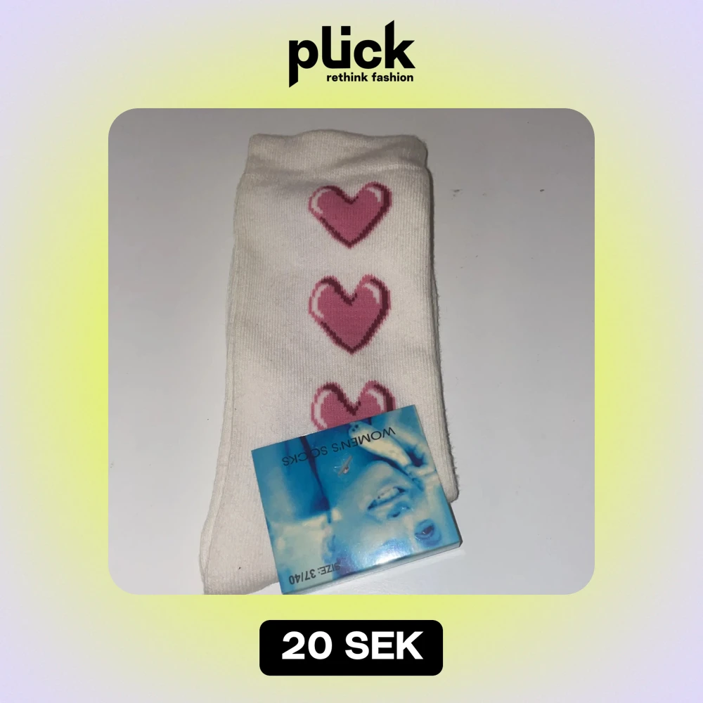 Säljer ett par vita strumpor med tre söta rosa hjärtan på framsidan. De är i nytt skick och perfekta för att ge en gullig touch till din outfit. Strumporna är mjuka och bekväma, idealiska för vardagsbruk.