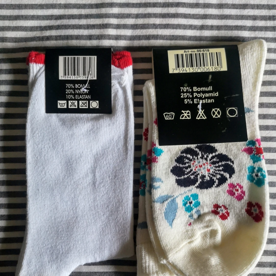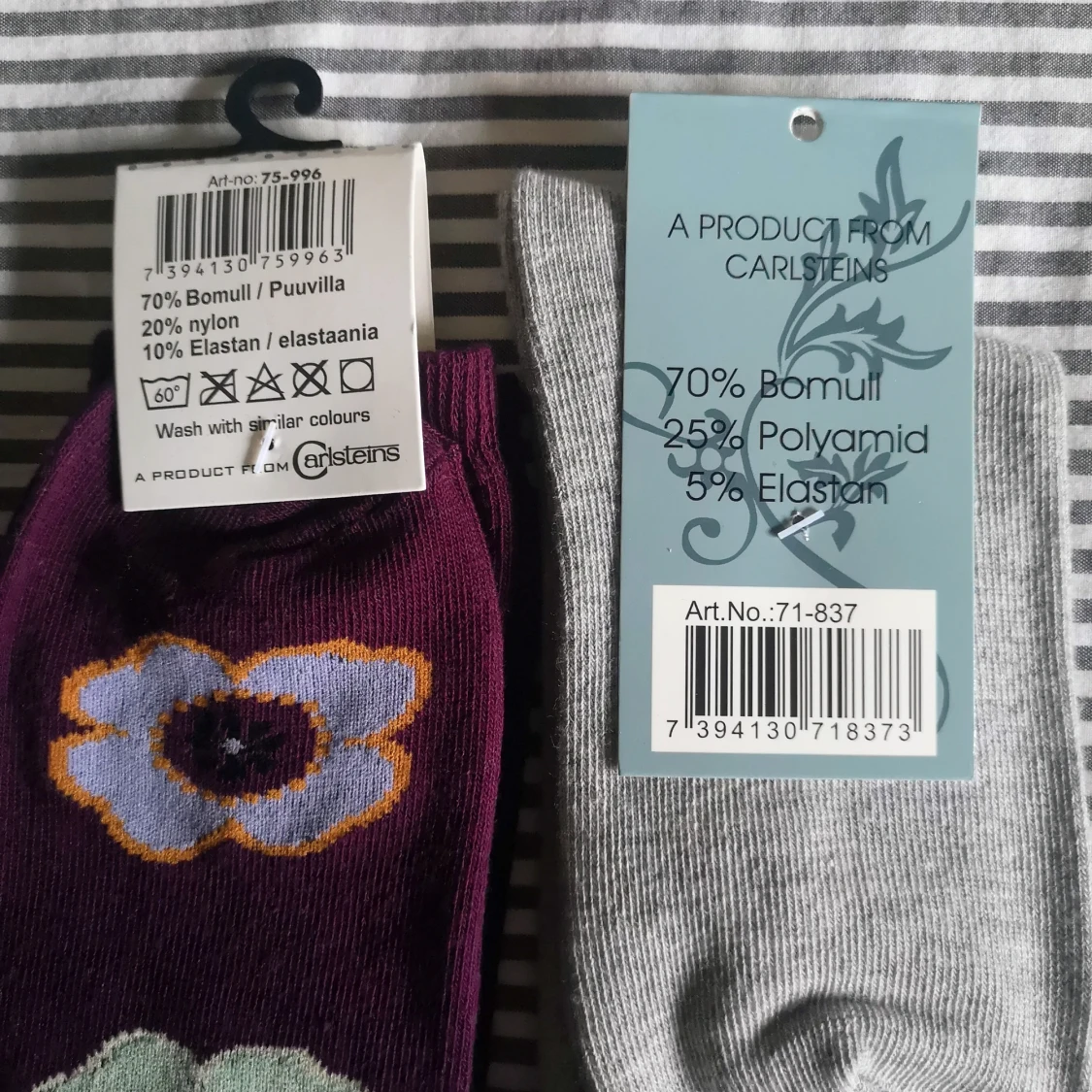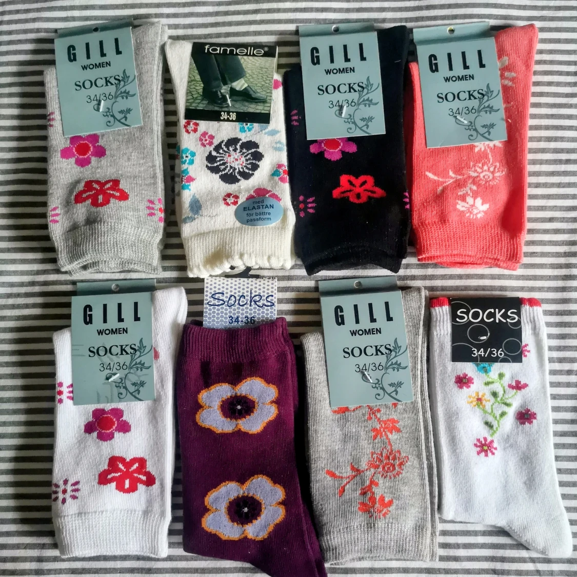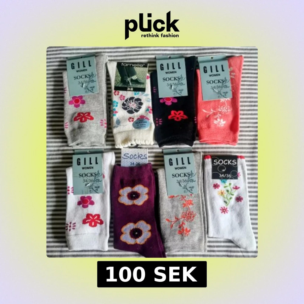 Helt nya, stl 34 /36 Finstickade strumpor med fina motiv i mjuk bomullsblandning, har högt skaft med resår, rök och djurfri hem.
