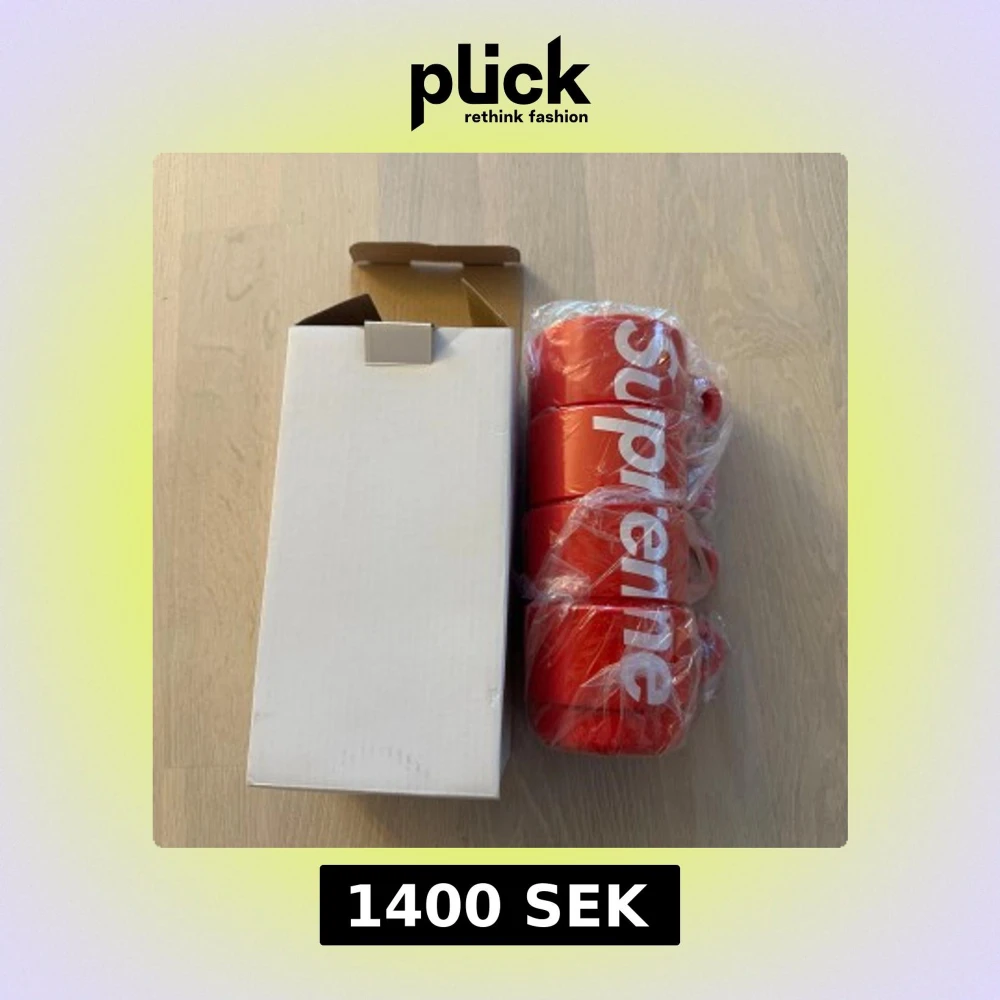 Fyra röda muggar från Supreme, levereras i originalförpackning och plast. Muggarna är oanvända och i nyskick, perfekta för samlare eller som present. Ikonisk Supreme-logga tryckt på varje mugg. Inga synliga defekter eller slitage.