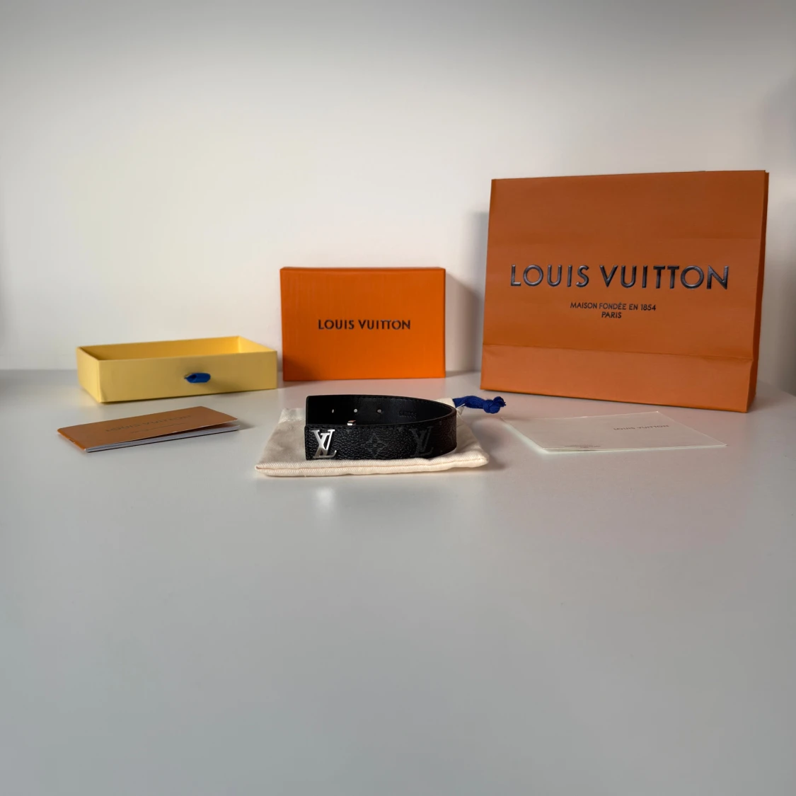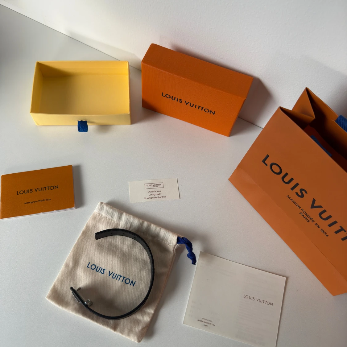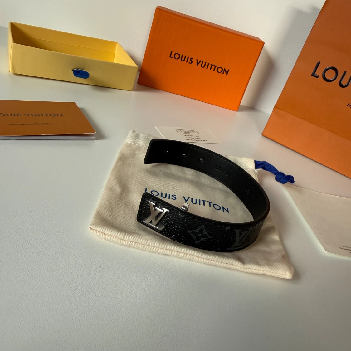 Säljer ett svart armband i äkta skinn med ikoniskt monogrammönster och silverfärgat märke . Armbandet har en stilren och klassisk design som lyfter din outfit. Levereras med originalpåse, box och certifikat.
