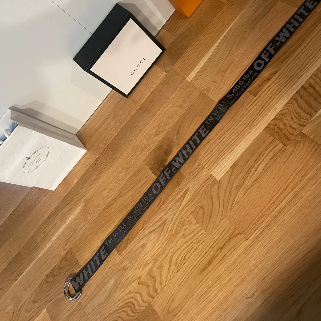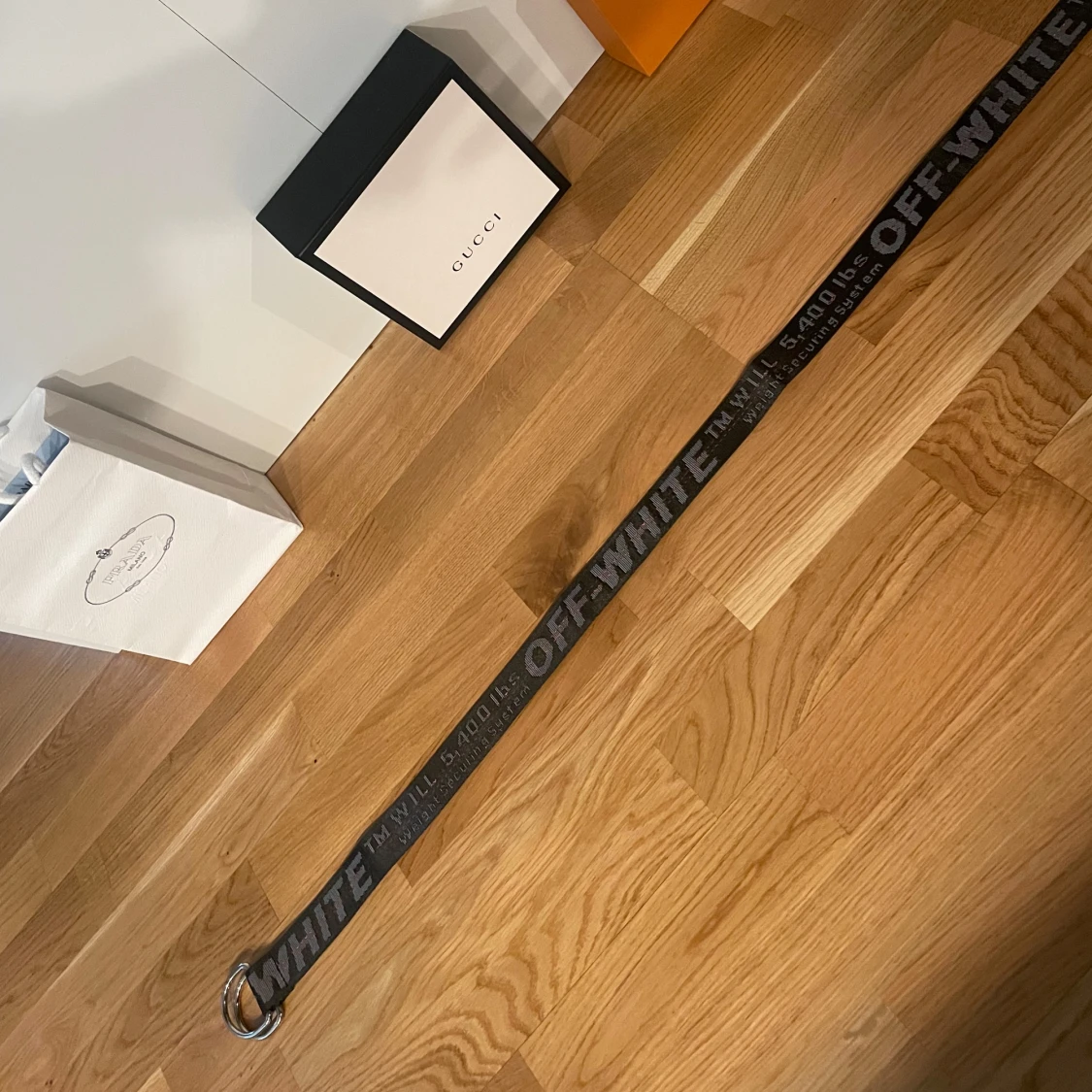 Helt ny och oanvänd Snyggt svart bälte från Off-White med märkets logga i vitt. Bältet har en modern design med en metallring som spänne. Perfekt för att ge din outfit en trendig touch.