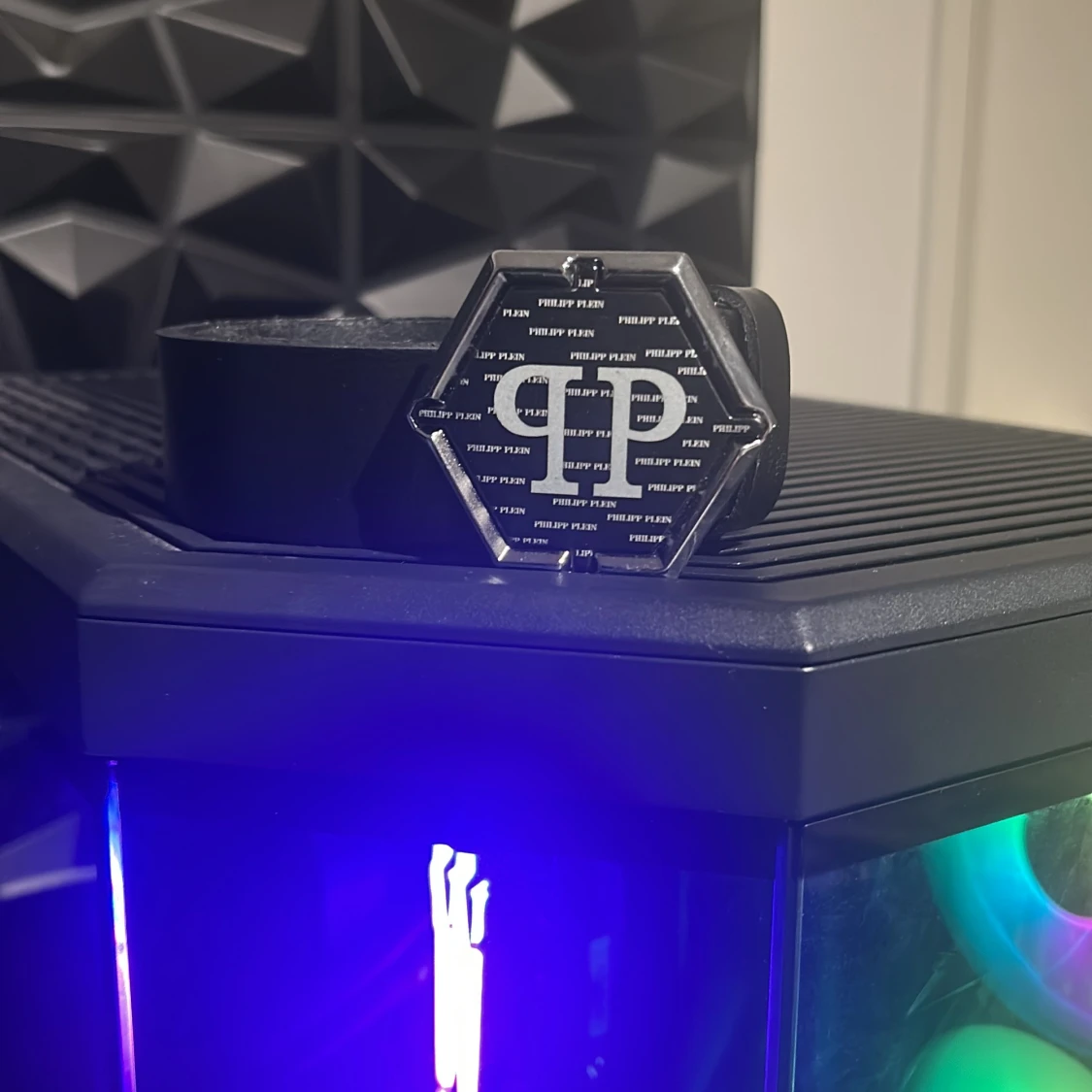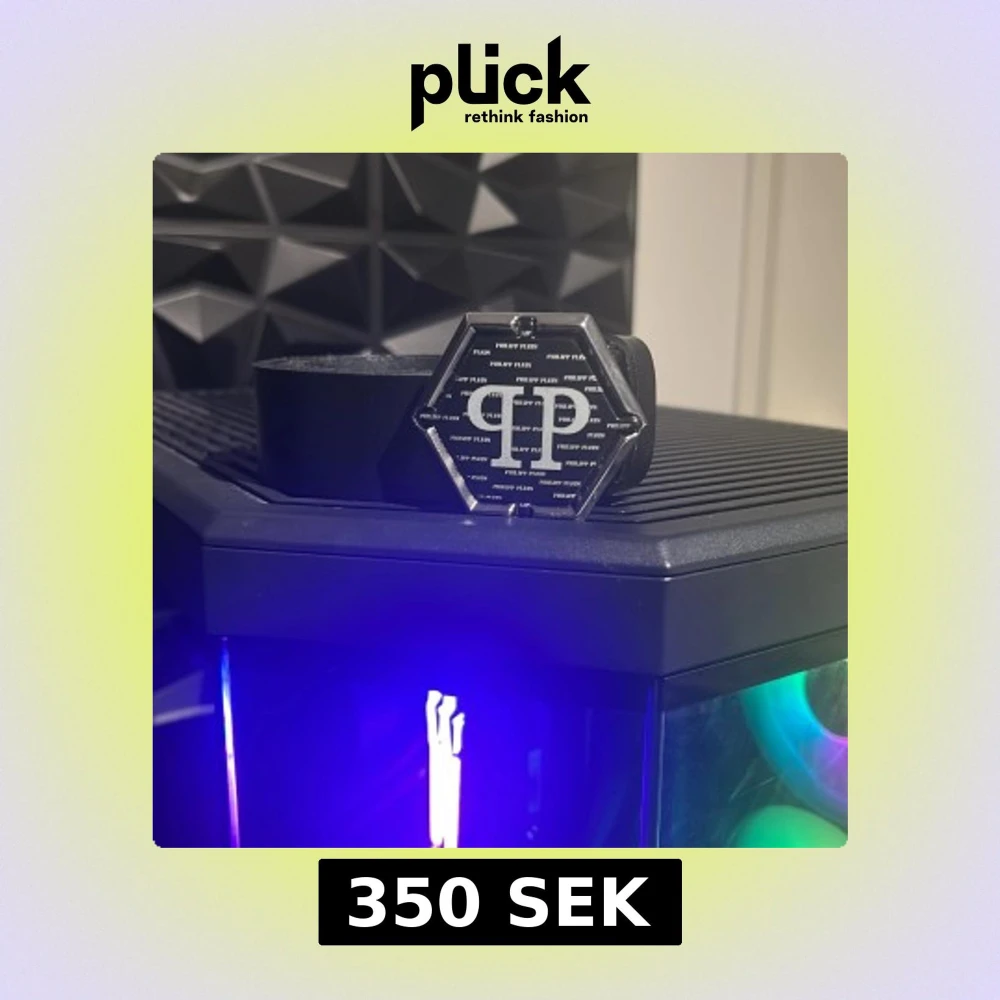 Snyggt svart bälte från Philipp Plein med en unik sexkantig spänne i silverfärg. Spännet har logotyp och mönster med texten 'PHILIPP PLEIN' över hela ytan. Bältet har en stilren och modern look som passar till jeans eller kostym.