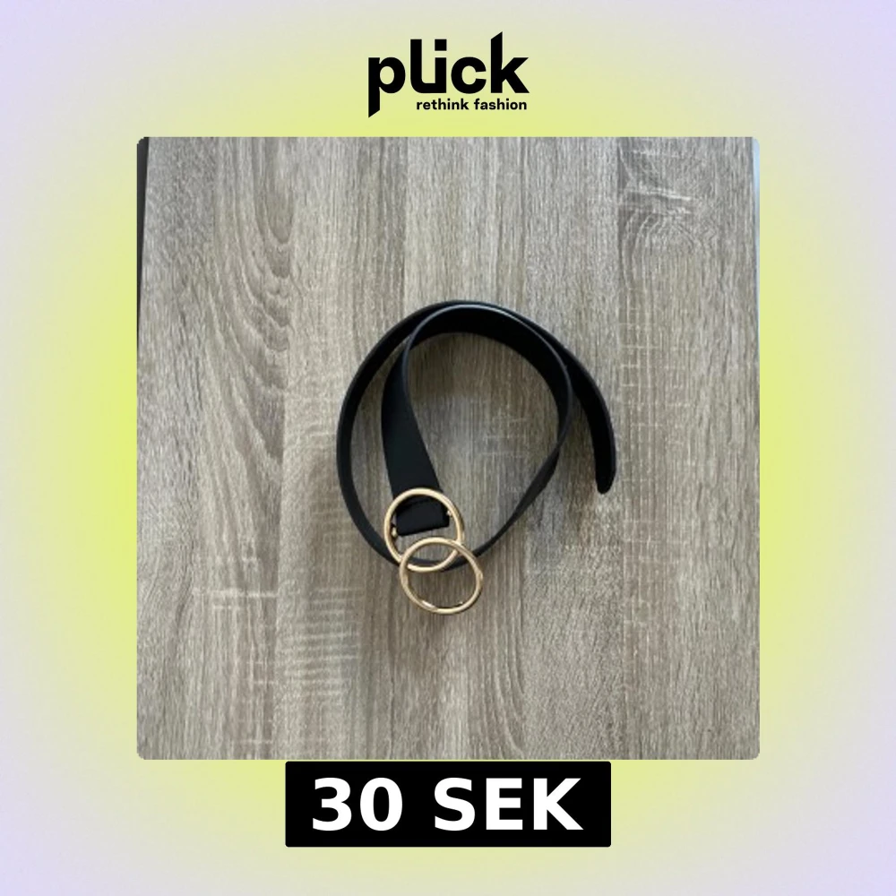 Snyggt svart bälte med två stora, runda guldfärgade ringar som spänne. Bältet är i slät skinnimitation och har en stilren, modern look som passar till jeans eller klänning. Perfekt accessoar för att lyfta din outfit med en cool detalj.