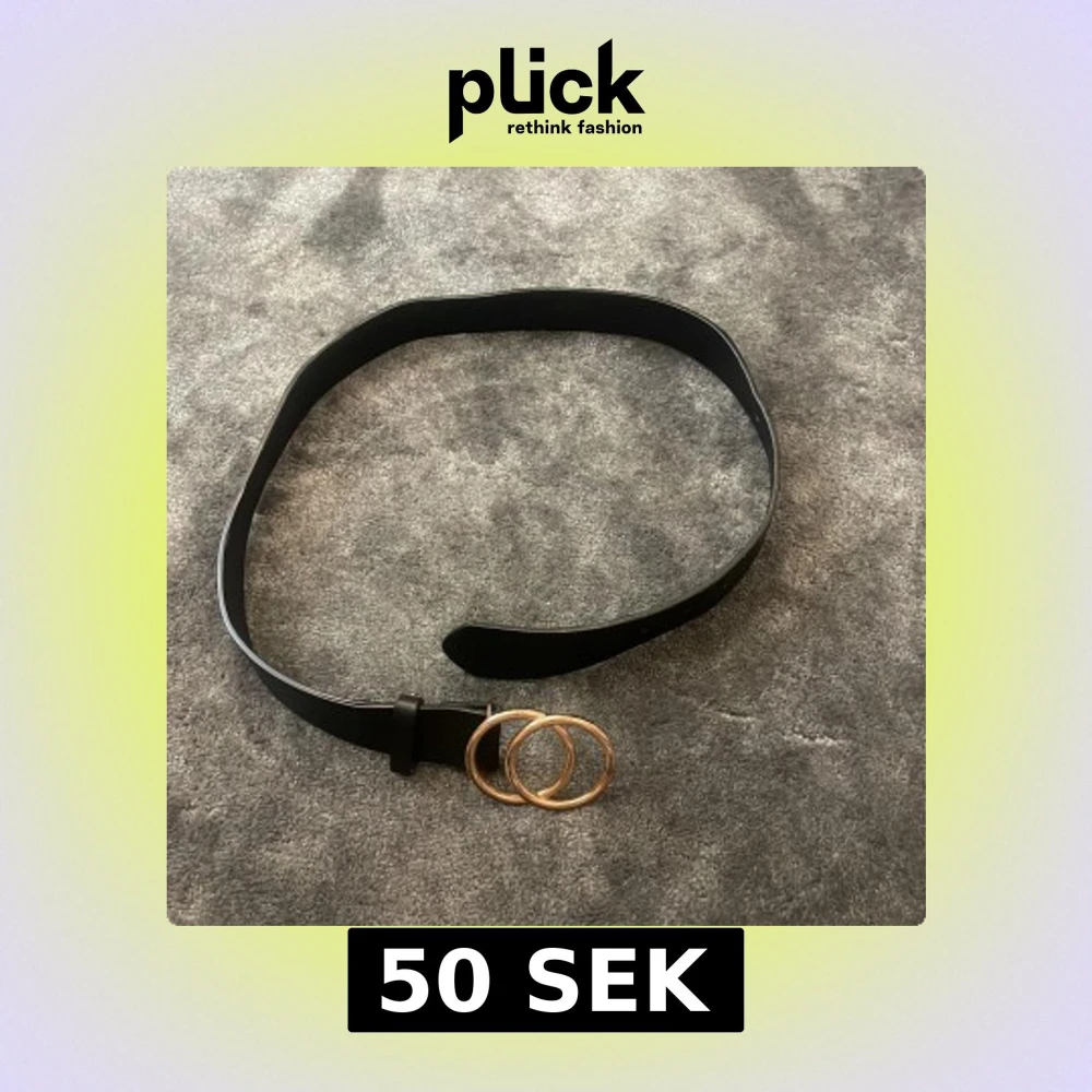 Stilrent svart bälte med två stora guldfärgade ringar som spänne. Bältet är i slätt material och har enkel design utan extra detaljer.