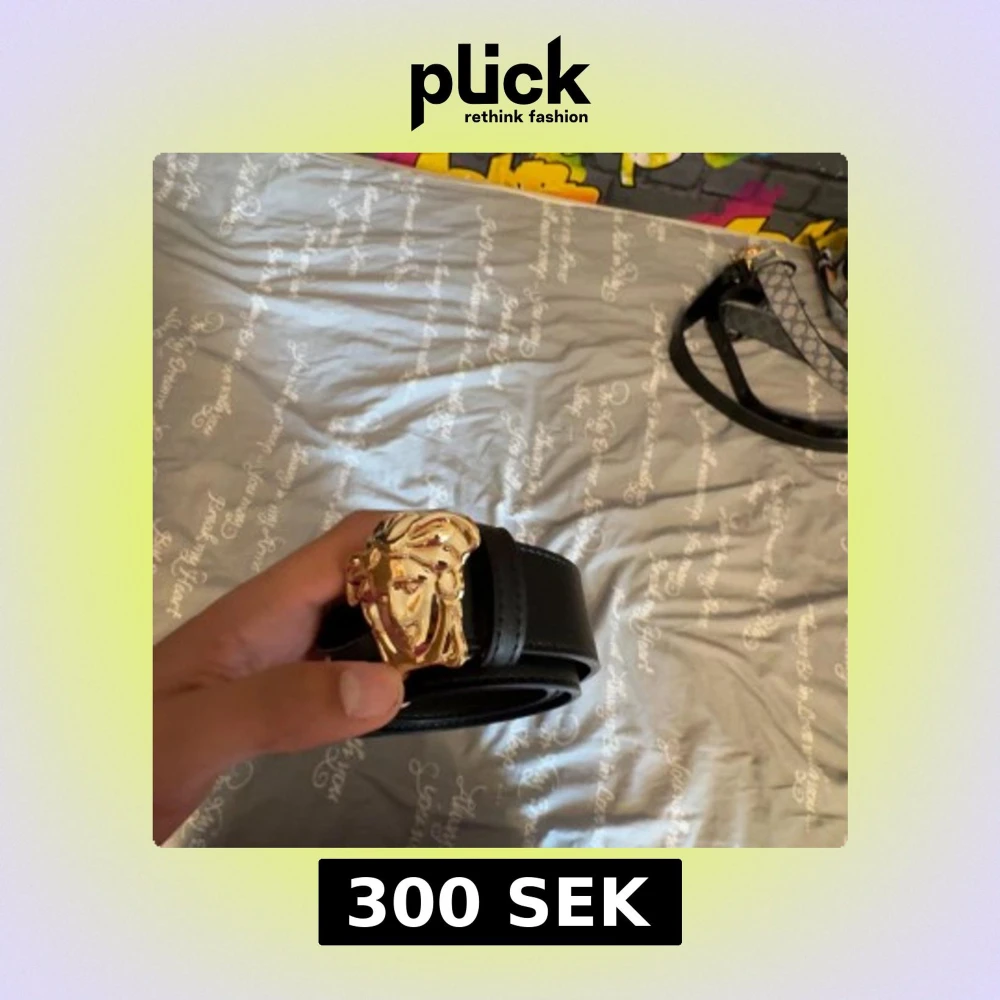 Säljer ett svart bälte med ett stort, detaljerat guldspänne som har ett ansikte i relief. Bältet är stilrent och gjort i slätt material, perfekt för att lyfta en outfit.