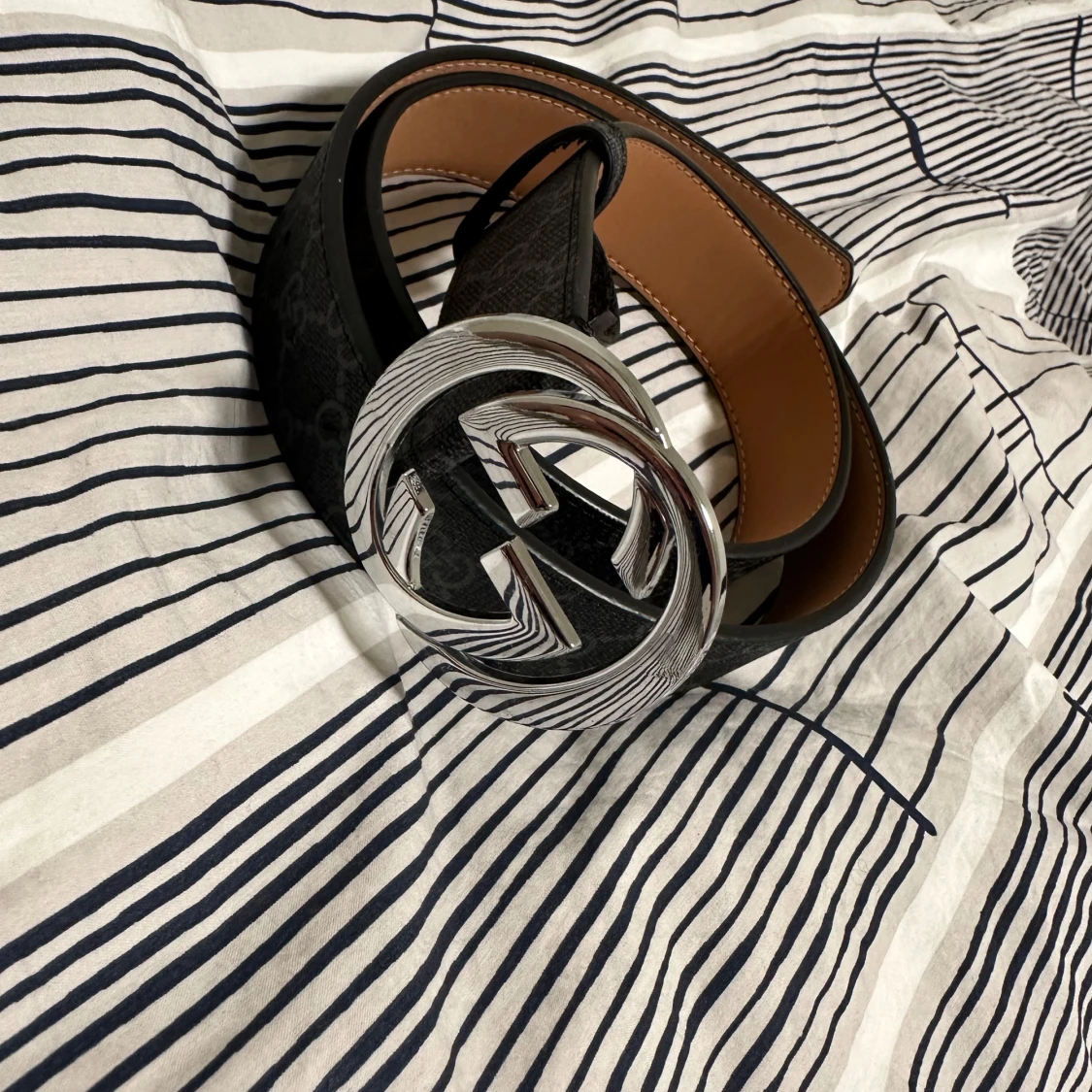 Snyggt svart bälte med ett stort, runt silverfärgat spänne. Bältet har ett diskret mönster och är perfekt för att ge en stilren touch till din outfit. Passar bra till både jeans och kostymbyxor.