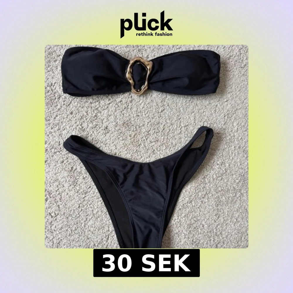 Säljer en svart bandeau bikini med snygg guldfärgad metallring framtill. Överdelen är axelbandslös och har knytning i ryggen. Oanvänd och i storlek S.