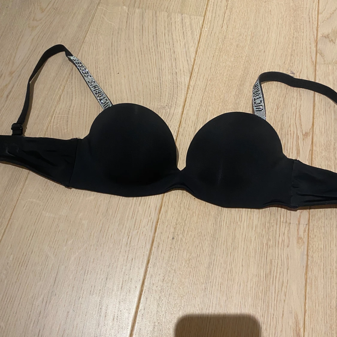 Snygg svart push-up bh från Victoria's Secret med justerbara axelband dekorerade med glittriga stenar. Perfekt för att ge en touch av glamour till din outfit. Axelbanden är avtagbara om man skulle vilja byta bh. I storlek 75A skriv för fler frågor🤍