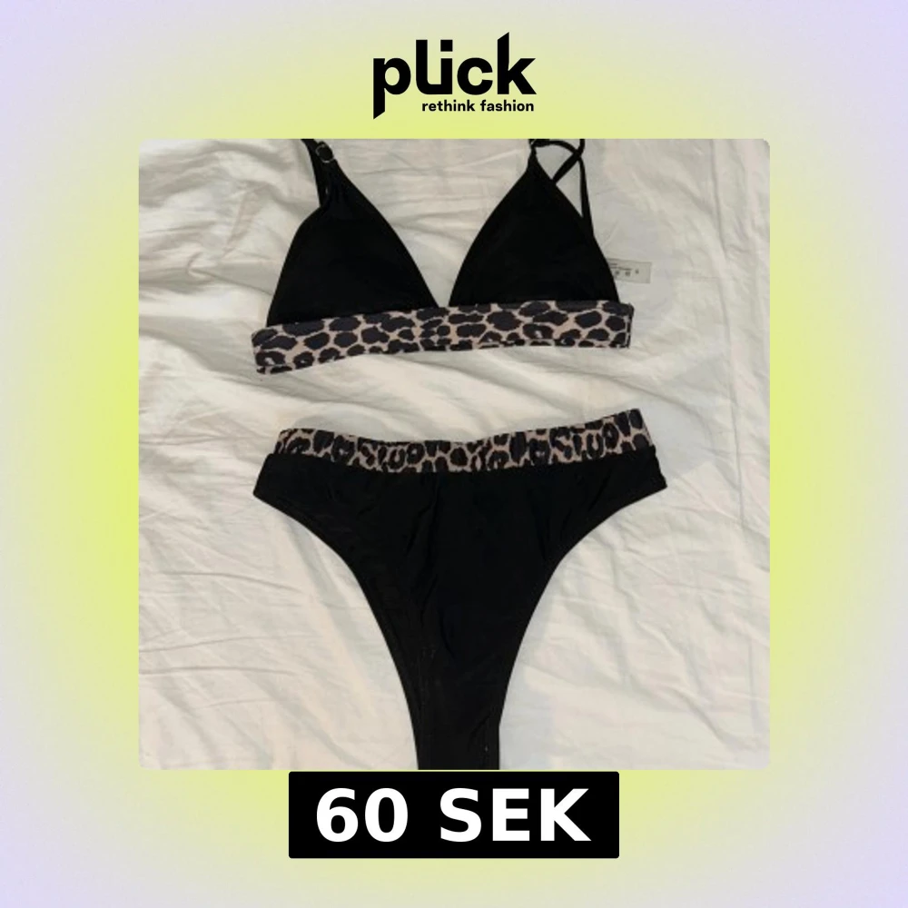 Trendig svart bikini med leopardmönstrade detaljer. Överdelen har smala axelband och en bred leopardkant under bysten. Underdelen är högmidjad med matchande leopardkant. Säljer då överdelen är för liten.