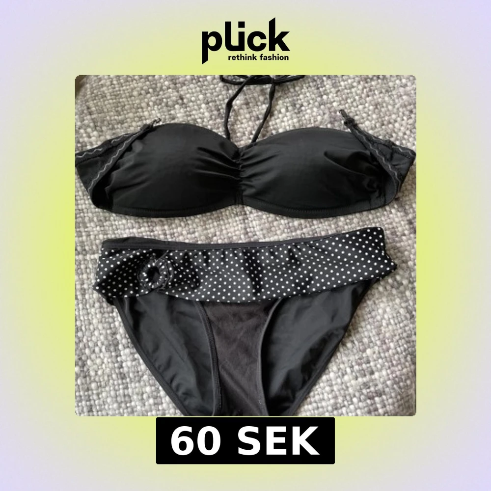 Svart bikini med bandeau-topp som har knytband i nacken och lätt rynk framtill. Bikinitrosan har en svart bas och en bred volangkant upptill i svart med vita prickar samt en liten rosett på sidan.