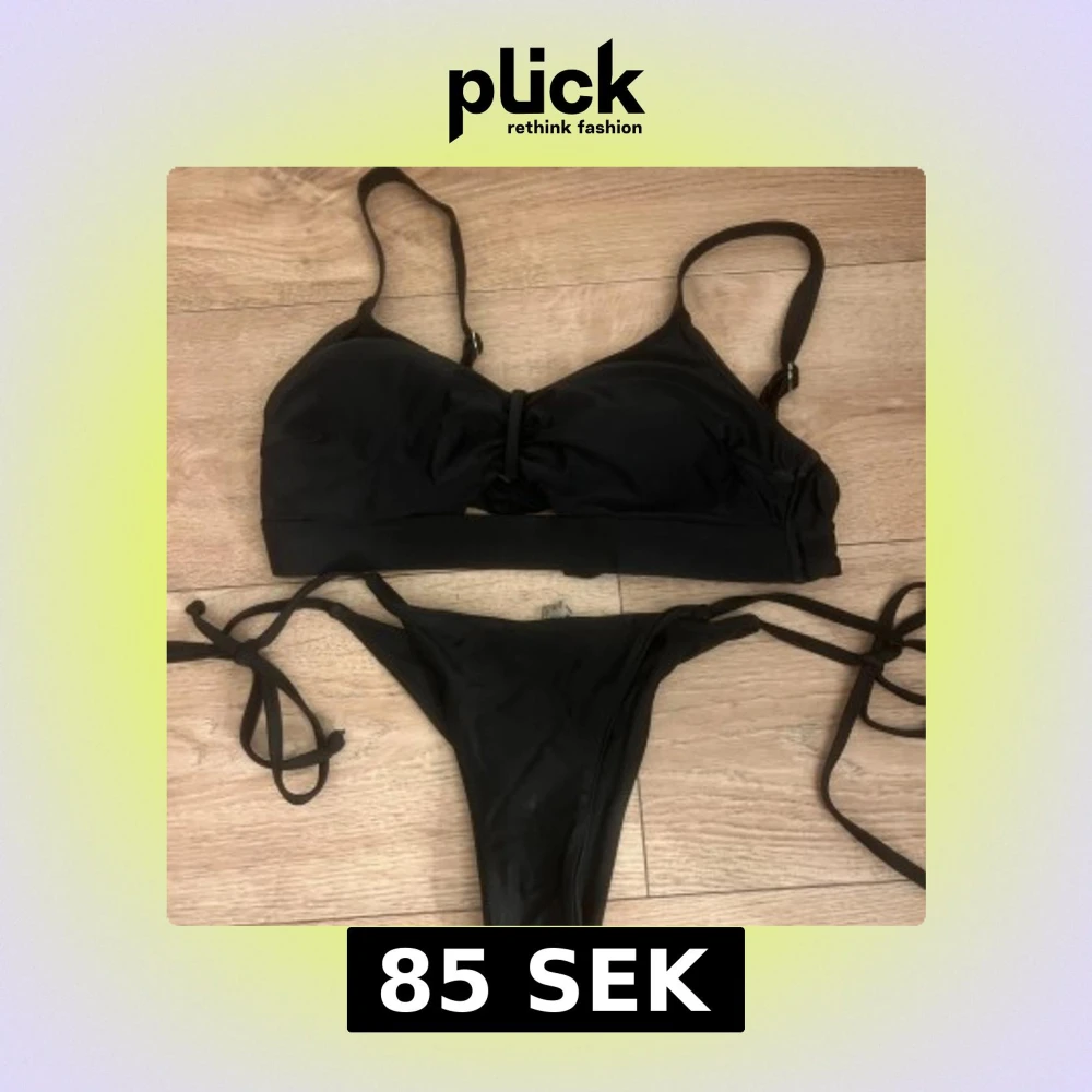 Svart Bikini, snören på underdelen och rosett man knyter i ryggen på överdelen💌 Överdelen är i ungefär i storlek 75D och underdelen är i storlek M💌