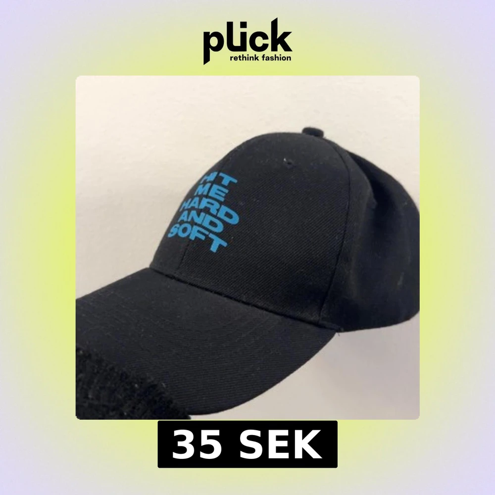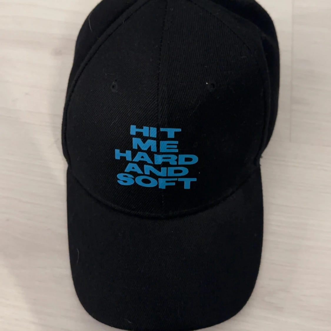 Svart keps med böjd skärm och trycket 'HIT ME HARD AND SOFT' i blått framtill. Klassisk modell med justerbar baksida, tillverkad i bomull. Perfekt accessoar för en cool och avslappnad stil.