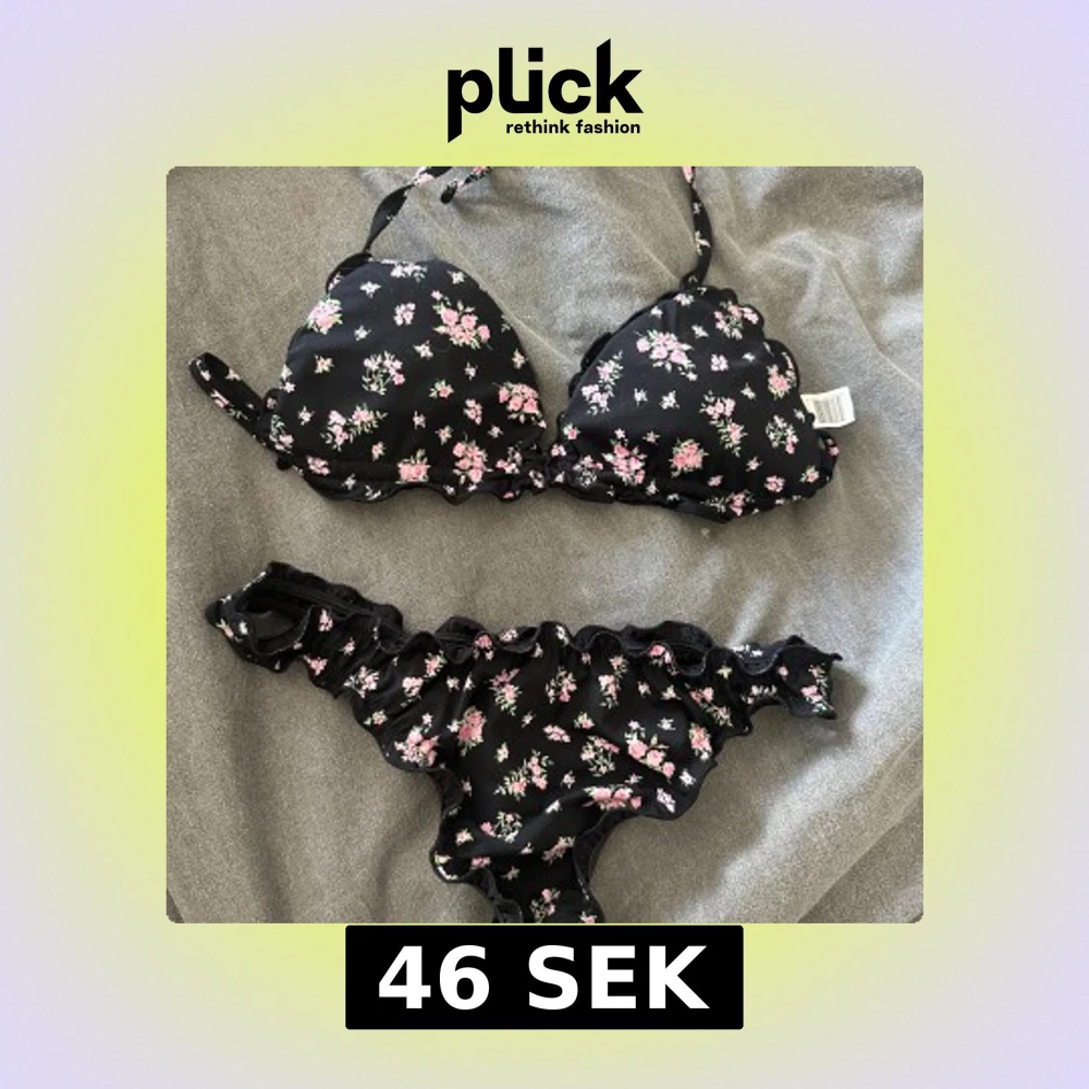 Säljer en svart bikini med små rosa och vita blommor. Både överdel och underdel har volangdetaljer och bikinin har en feminin och söt stil. Överdelen har knyt i nacken och underdelen har rynkade kanter. ENDAST TESTAD!