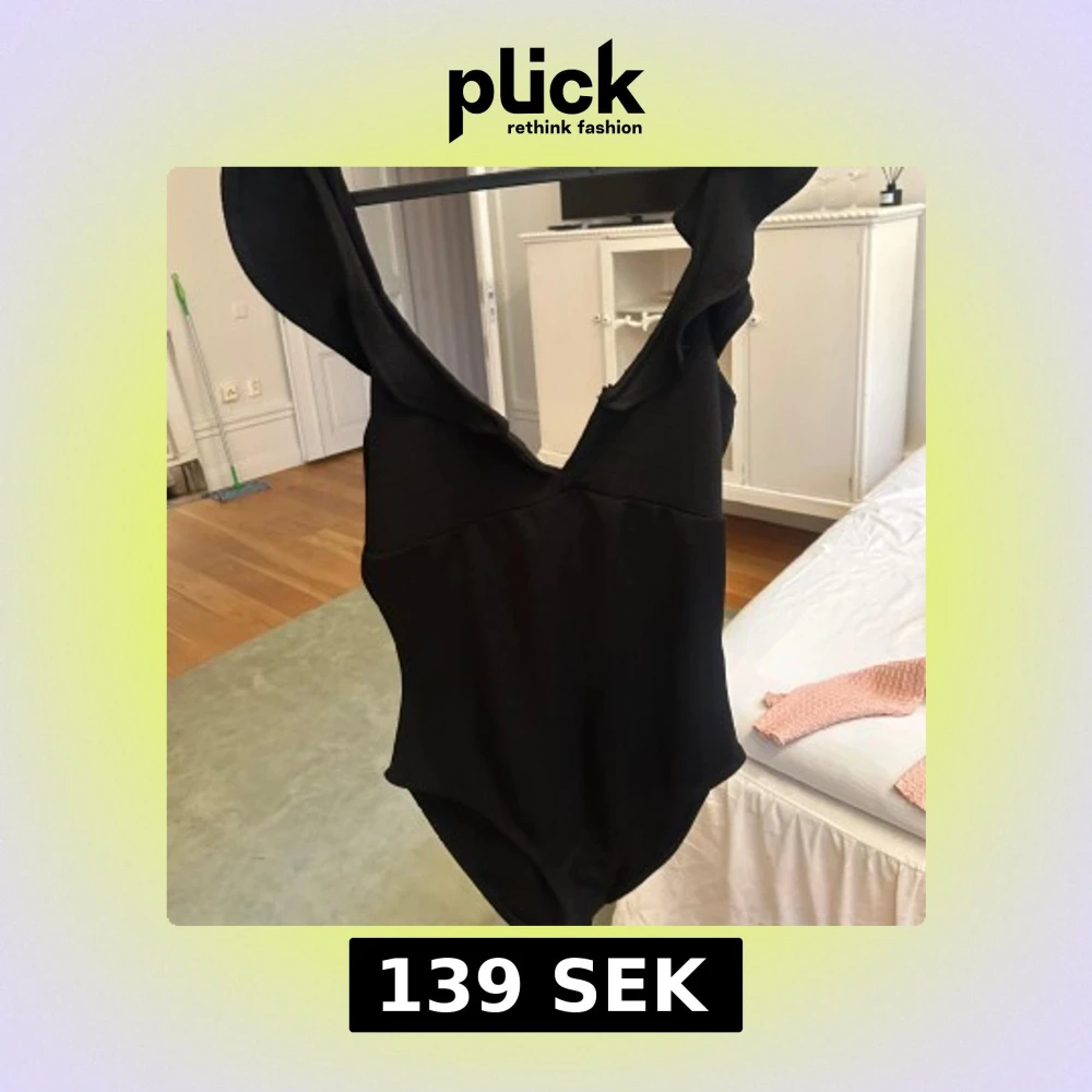 Supersnygg svart body med djup v-ringning och breda axelband med volangdetaljer. Perfekt för en stilren och trendig look. Enkel men ändå elegant design som passar dig som vill sticka ut lite extra.