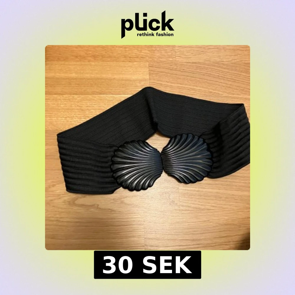 Säljer ett svart elastiskt midjebälte med två stora snäckformade spännen framtill i metall-look. Bältet är brett och ger en markerad midja, perfekt för att lyfta en outfit med en cool detalj.