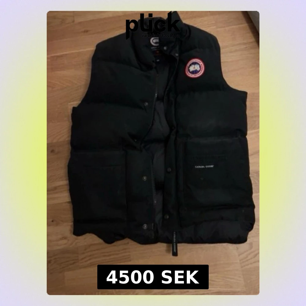 Svart dunväst från Canada Goose med klassisk logotyp på bröstet. Västen har hög krage, två stora fickor framtill och dragkedja med tryckknappar. Perfekt för kalla dagar och har en stilren, tidlös look.
