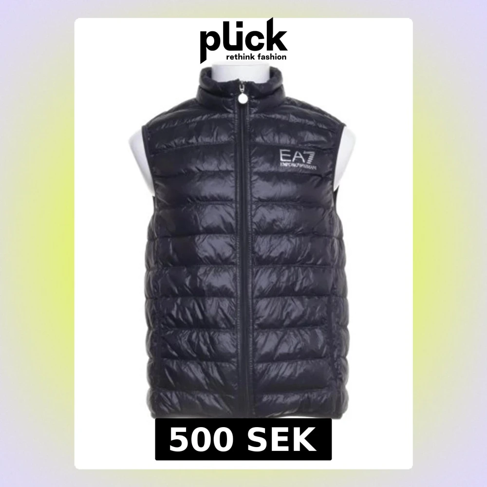 Säljer en svart dunväst från Emporio Armani EA7 med quiltad design och hög krage. Västen har en snygg logotyp på bröstet och dragkedja framtill. Perfekt för lager-på-lager och streetstyle. Passar dig som gillar stilrena och sportiga plagg.