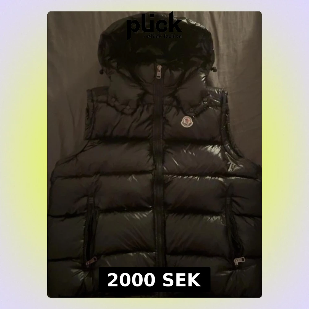 Säljer en svart, glansig dunväst från Moncler med huva och två dragkedjefickor. Västen har quiltad design, Moncler-logga på bröstet och innerfoder med serietidningsmönster. Perfekt för dig som vill ha en snygg och varm väst med streetkänsla.