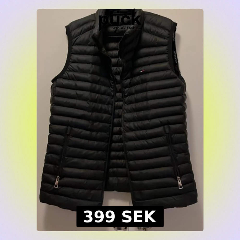 Säljer en svart dunväst från Tommy Hilfiger i storlek L. Västen har quiltad design med horisontella sömmar, två fickor med dragkedja och en hög krage. Materialet är 100% polyester och den har en diskret logotyp på bröstet. Perfekt för lager-på-lager under kyliga dagar.