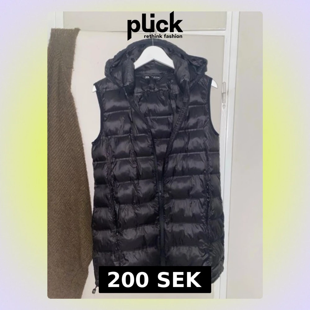 Svart dunväst från Zara med quiltad design och praktisk huva. Västen har dragkedja framtill och två sidofickor med dragkedja. Materialet är glansigt och känns lätt men ändå värmande. Perfekt för lager-på-lager och chill stil.