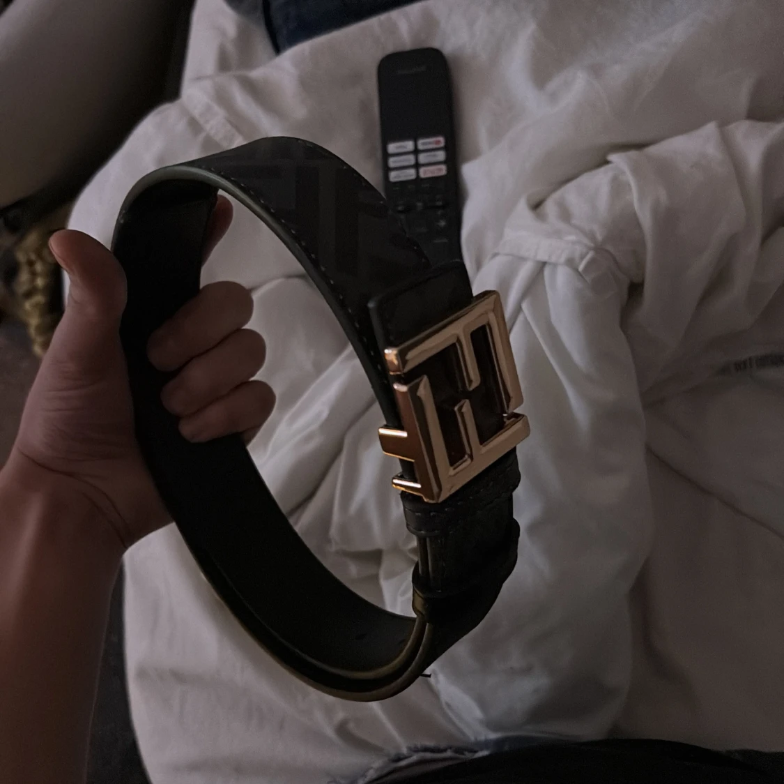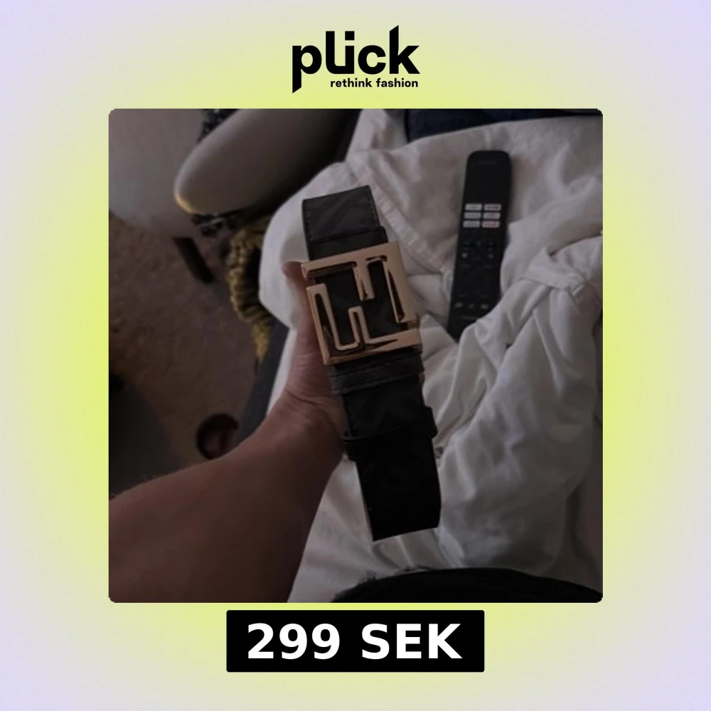 Säljer ett svart bälte från Fendi med bred design och ikoniskt FF-mönster. Bältet har ett stort, fyrkantigt spänne i guldmetall som verkligen sticker ut. Tillverkat i skinn och perfekt för att lyfta vilken outfit som helst.