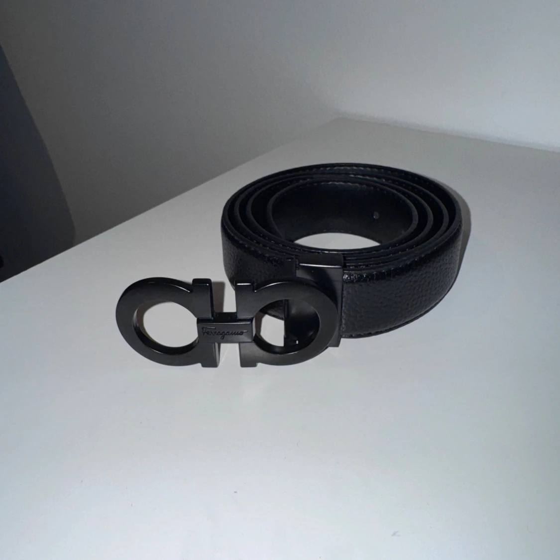 Säljer ett svart skärp från Ferragamo i skinn med en ikonisk dubbel Gancini-spänne i matt svart metall. Bältet har en stilren och klassisk design som passar till jeans eller kostymbyxor. Perfekt accessoar för att lyfta din outfit. (110cm)