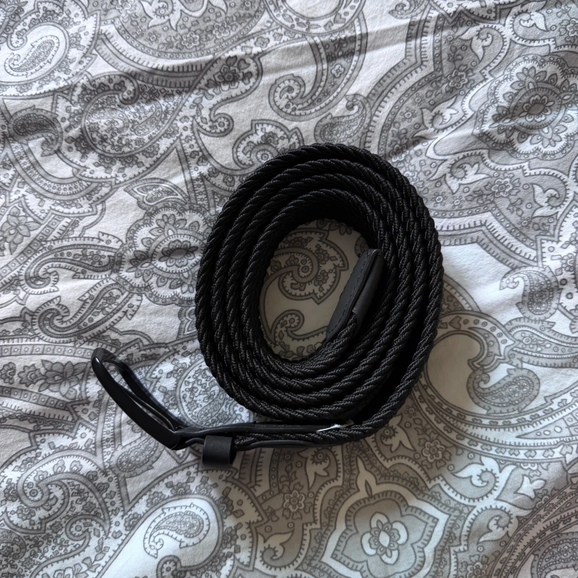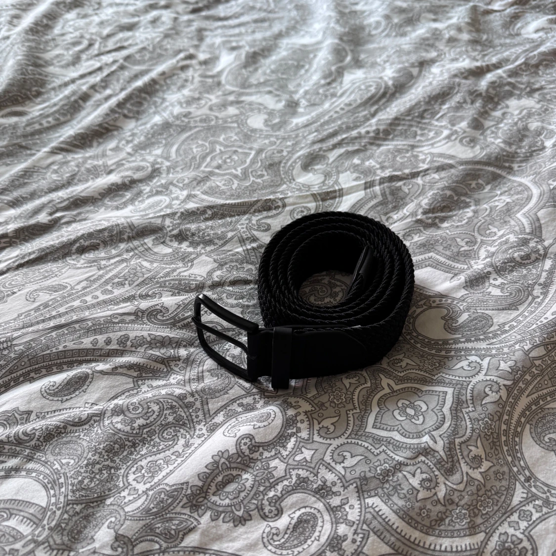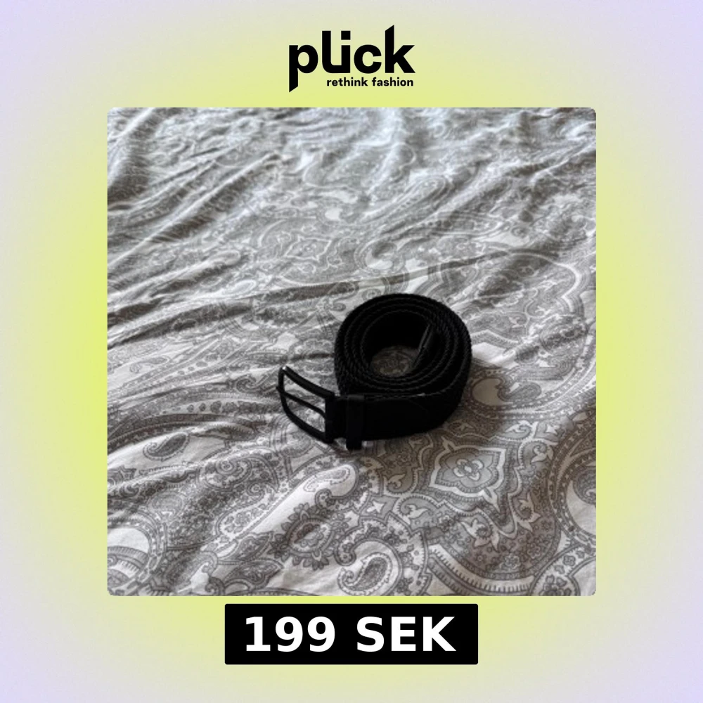 Säljer ett svart flätat bälte med stilrent svart metallspänne och detaljer i svart skinn. 105cm men bältet har en flexibel design som gör det enkelt att justera längden.