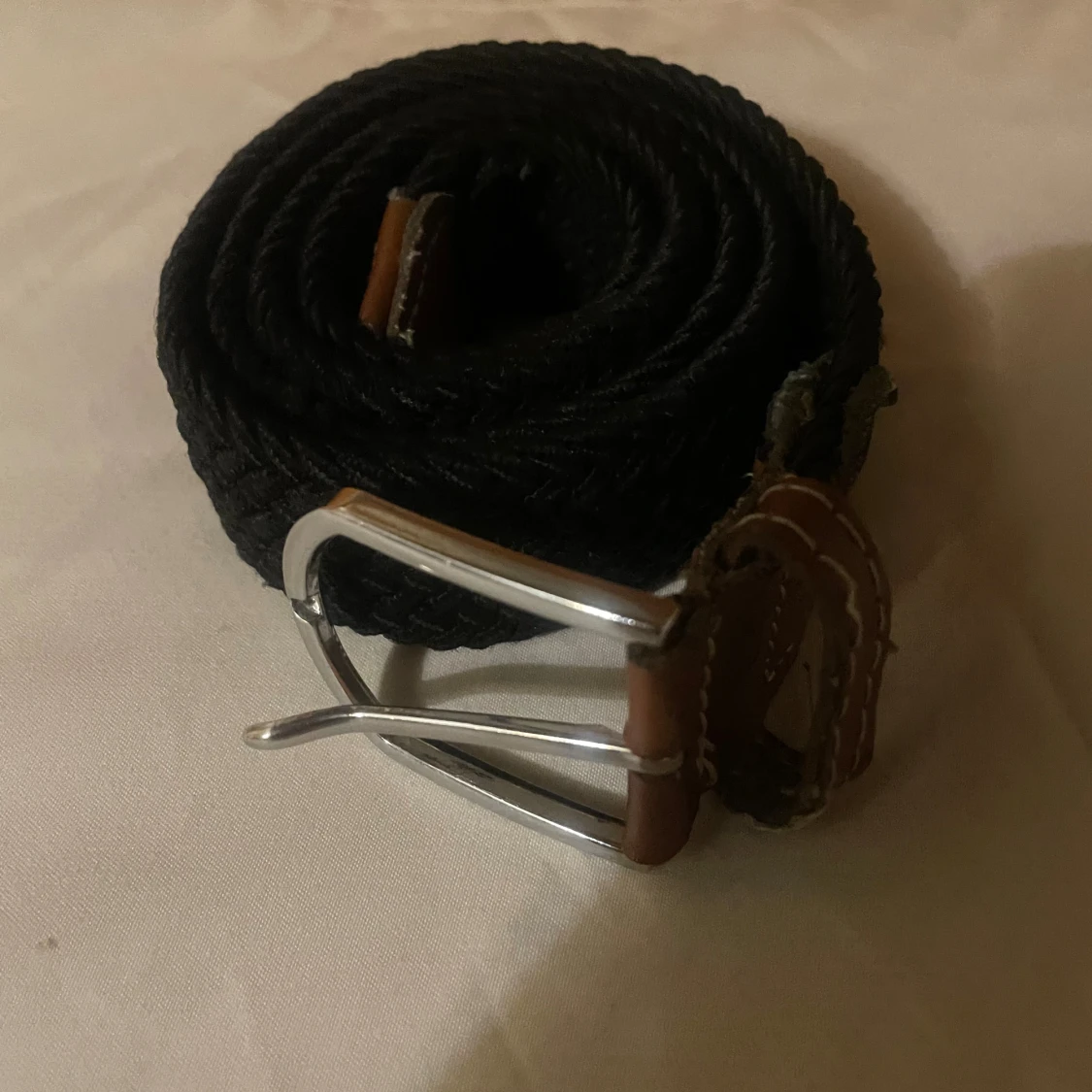 Svart flätat bälte med detaljer i brunt skinn och ett stilrent silverfärgat metallspänne. Bältet har vita sömmar på skinnpartierna och en klassisk rektangulär form på spännet. Perfekt för att ge outfiten en snygg touch.