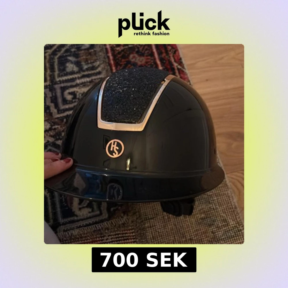 Säljer en svart ridhjälm från HS med glittrig panel upptill och snygga detaljer i roséguld. Hjälmen har en stilren, rundad form och justerbart hakband. Perfekt för dig som vill sticka ut i stallet med både säkerhet och stil.