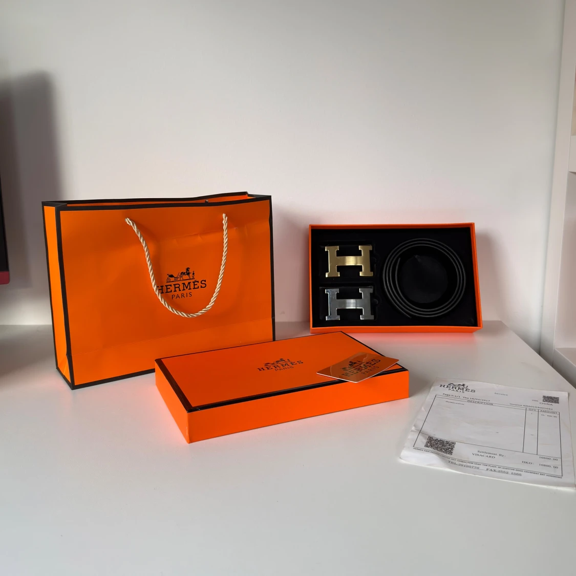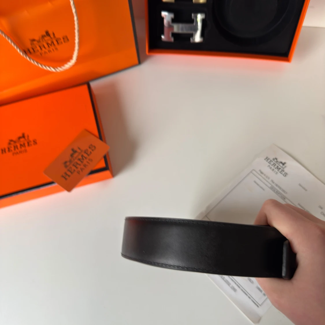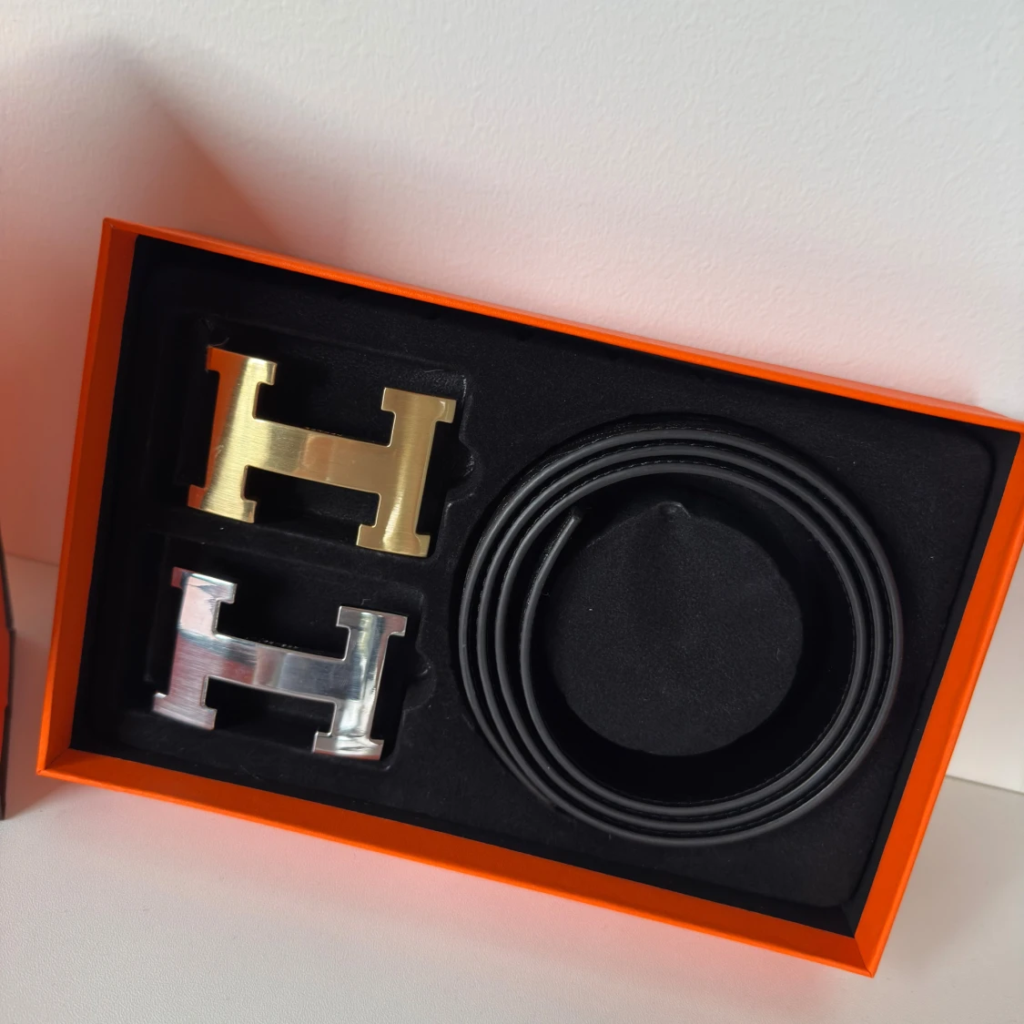 Exklusivt svart bälte från H Paris i skinn med präglad logga och diskreta detaljer. Levereras med två utbytbara H-spännen i guld och silver. Snyggt och stilrent, perfekt för dig som vill ha en lyxig accessoar med ikonisk design.