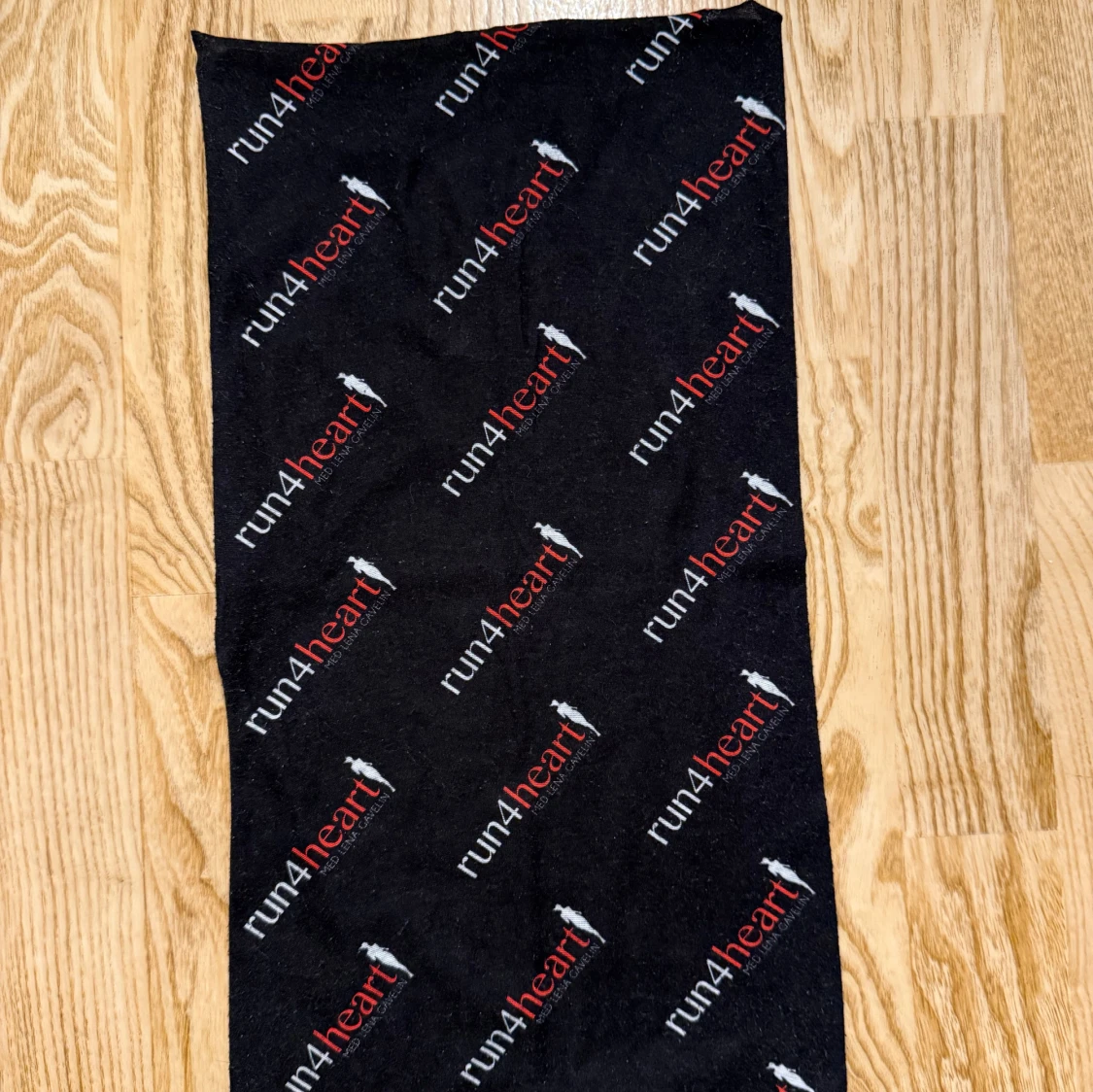 Svart tubhalsduk med tryckt Run4Heart-logga i vitt och rött över hela tyget. Perfekt accessoar för löpning eller utomhusaktiviteter. Mjuk och smidig att bära runt halsen.
