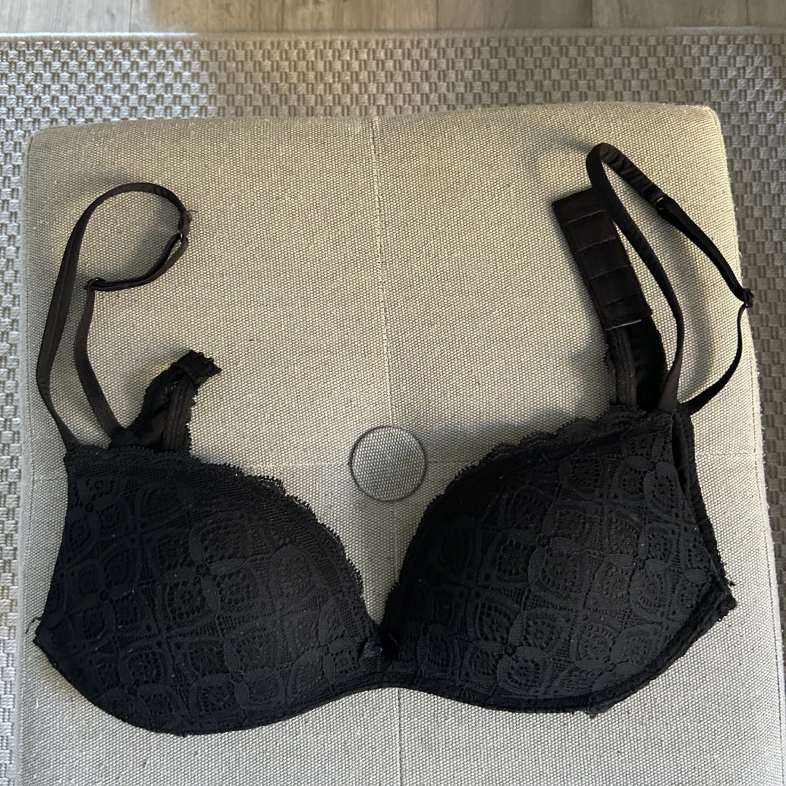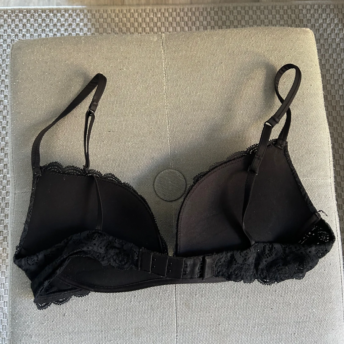 Svart bh med push-up och tunna axelband i modellen GIOIA från intimissimi. Kuporna är täckta av spets med snyggt mönster och har en liten rosett i mitten. Bh:n har justerbara axelband och knäppe bak. Perfekt för dig som gillar en feminin och stilren look. Säljer då den är för liten!