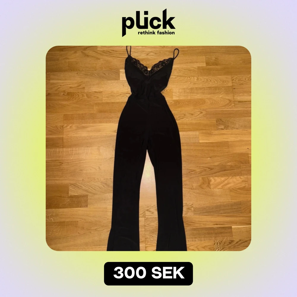 Snygg svart jumpsuit med smala axelband och v-ringning dekorerad med spets. Perfekt för festliga tillfällen! Materialet ser ut att vara mjukt och bekvämt, vilket gör den både stilren och skön att bära. Passar bra till både klackar och sneakers beroende på stil.