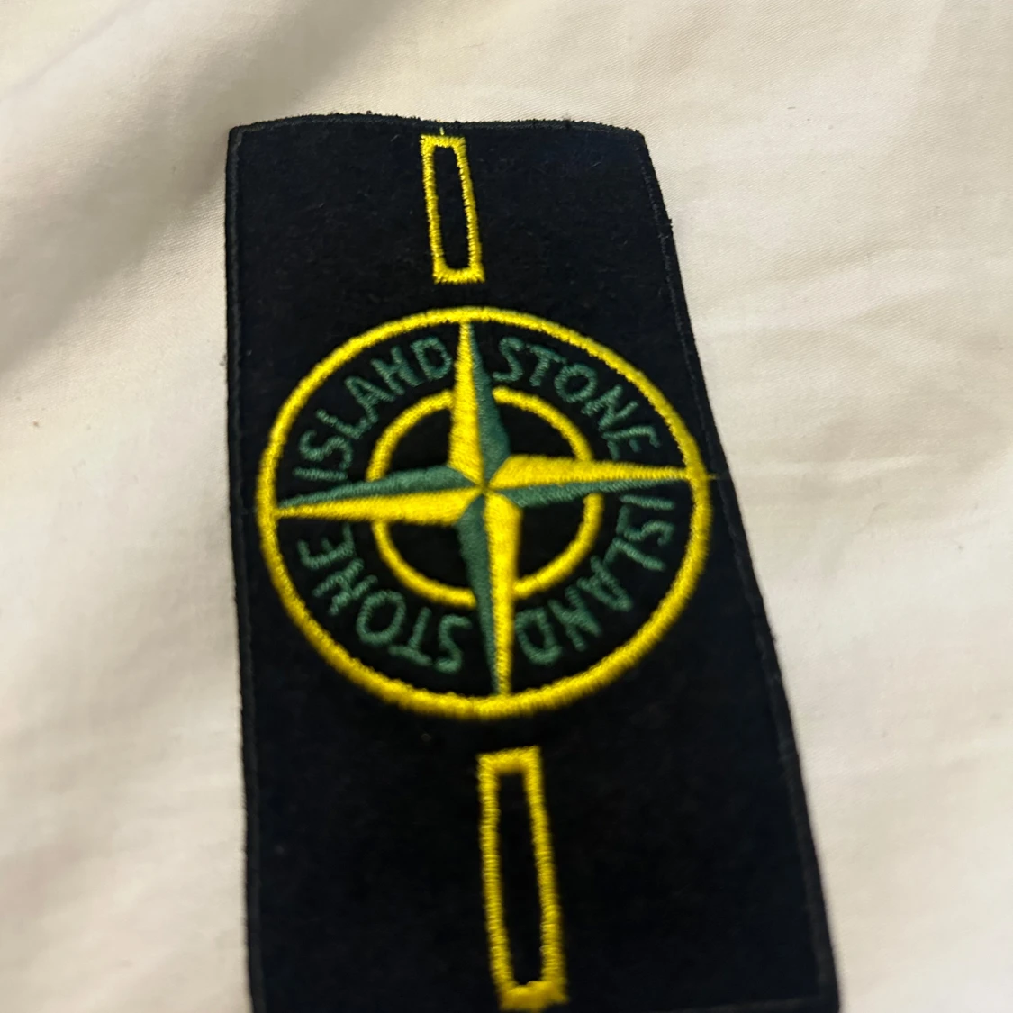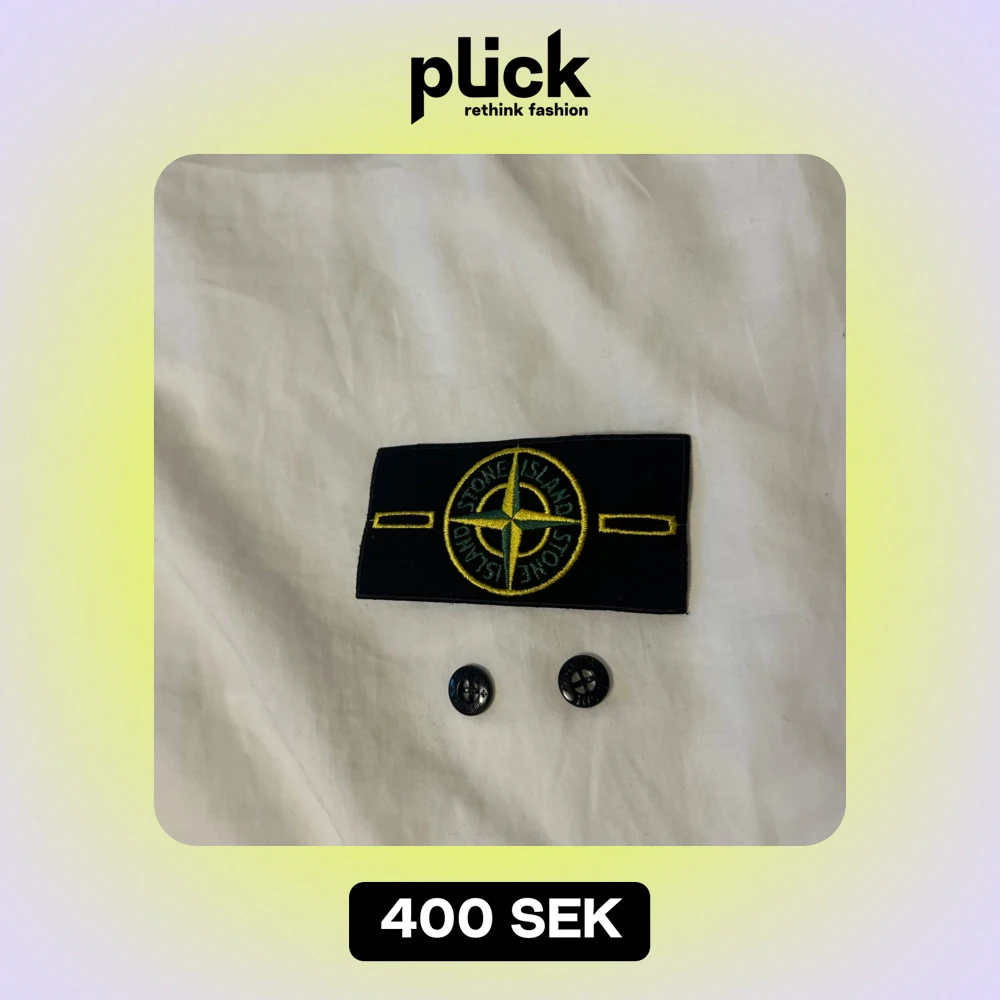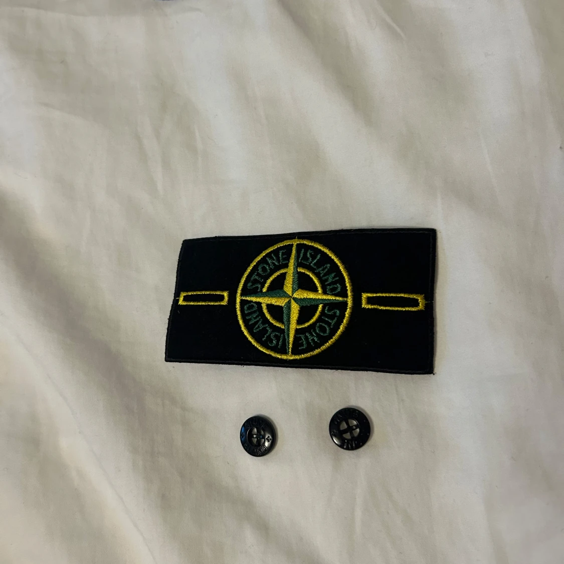Säljer ett svart märke från Stone Island med den ikoniska kompassloggan i gult och grönt. Märket är i nytt skick och kommer med två svarta knappar för enkel fastsättning. Perfekt för att ge din jacka eller tröja en stilren och exklusiv touch.