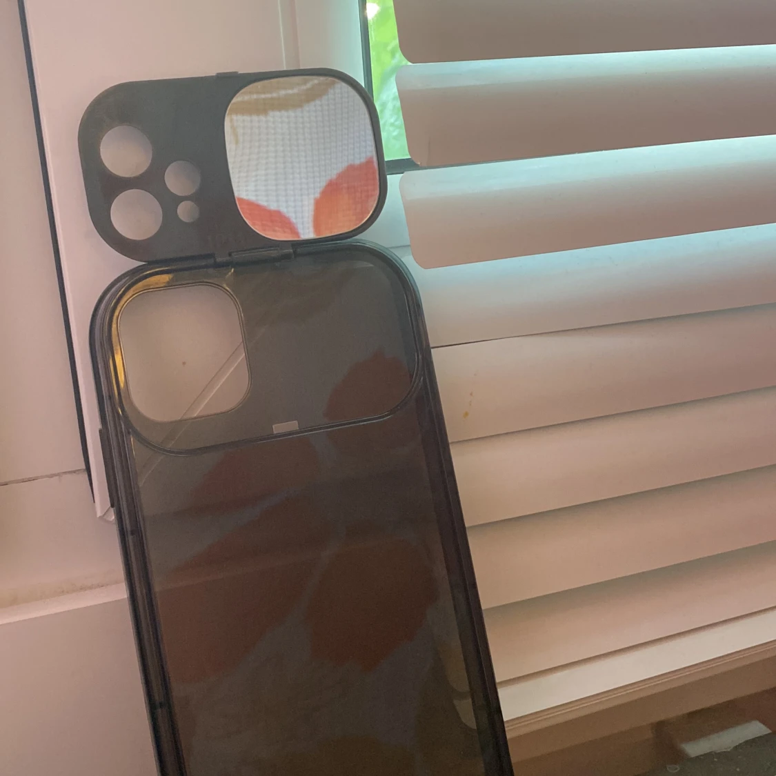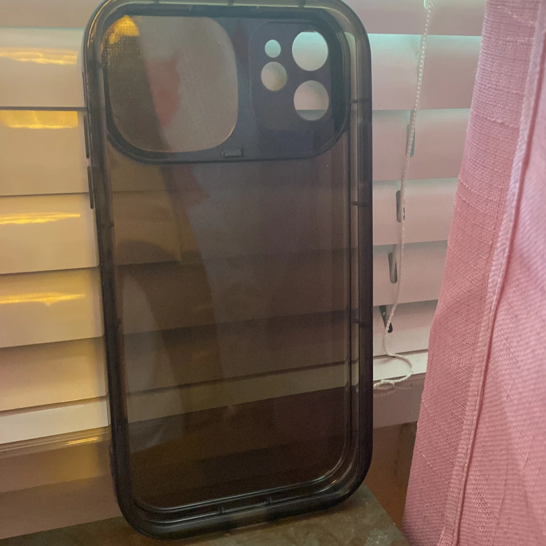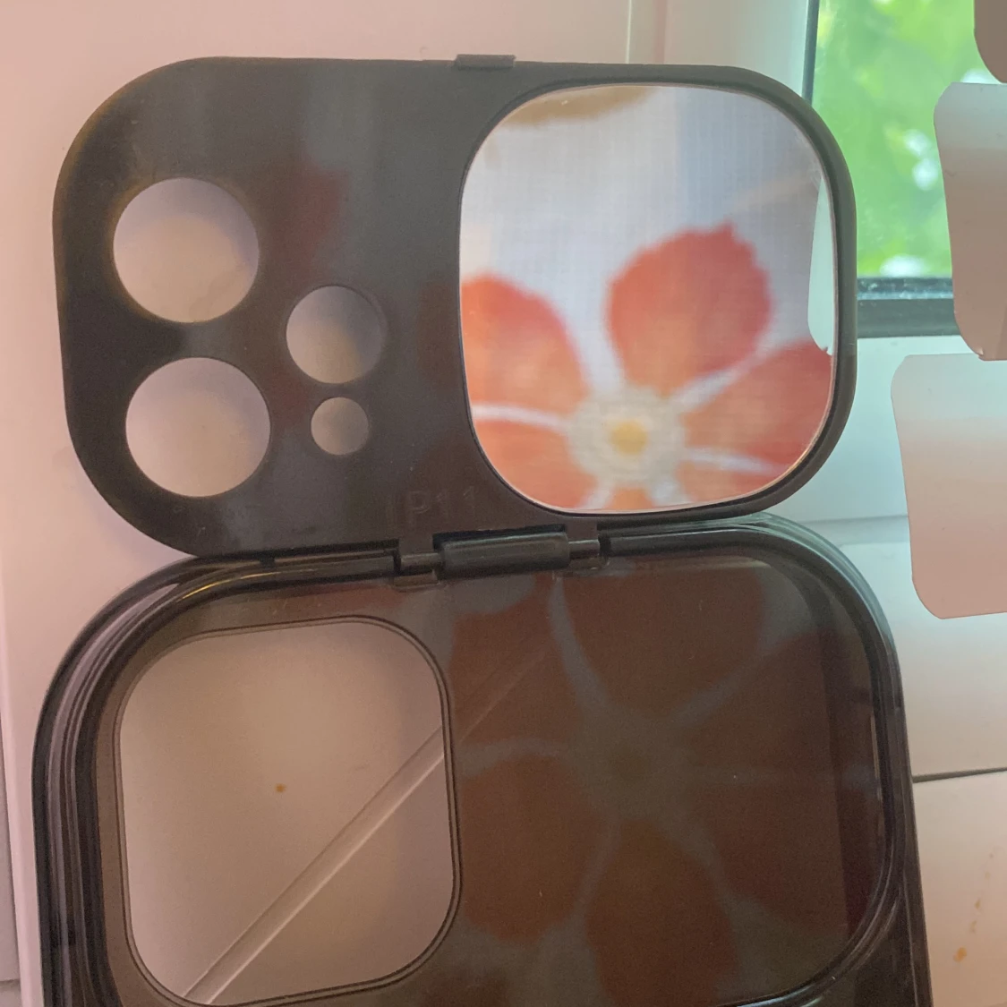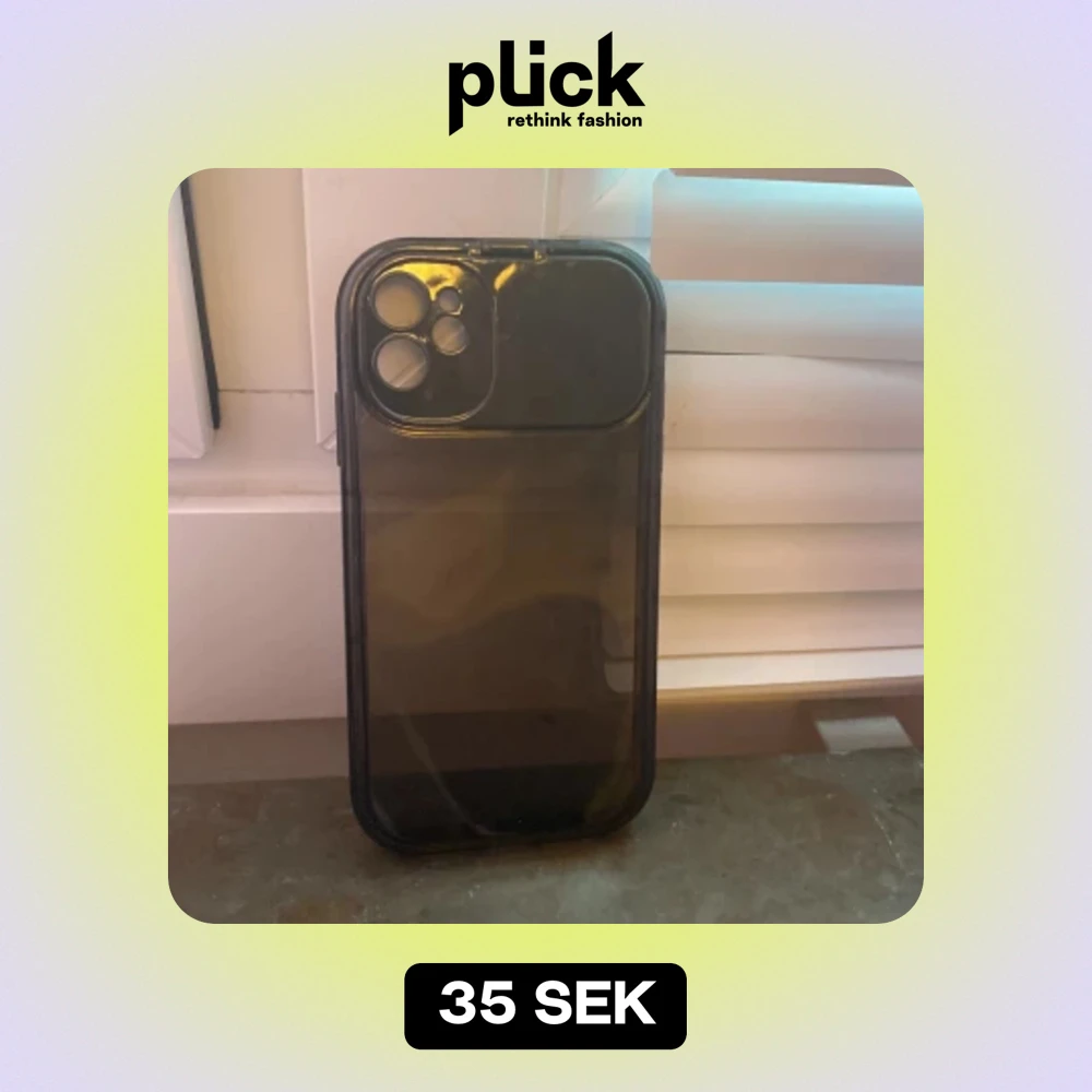 Ett svart mobilskal med inbyggt skydd för kameran. Skalet är genomskinligt och har en liten spegel samt så att det skyddar karman. jätte bra skick och det är för IPhone 11