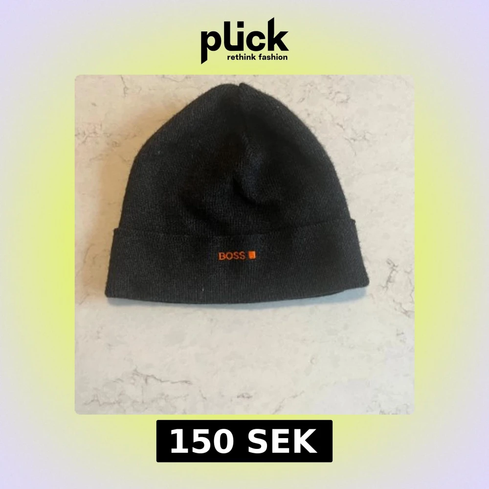 Svart mössa från HUGO BOSS med orange broderad logga framtill. Klassisk form med uppvikt kant, perfekt för kalla dagar. Materialet är mjukt och stickat för extra komfort.