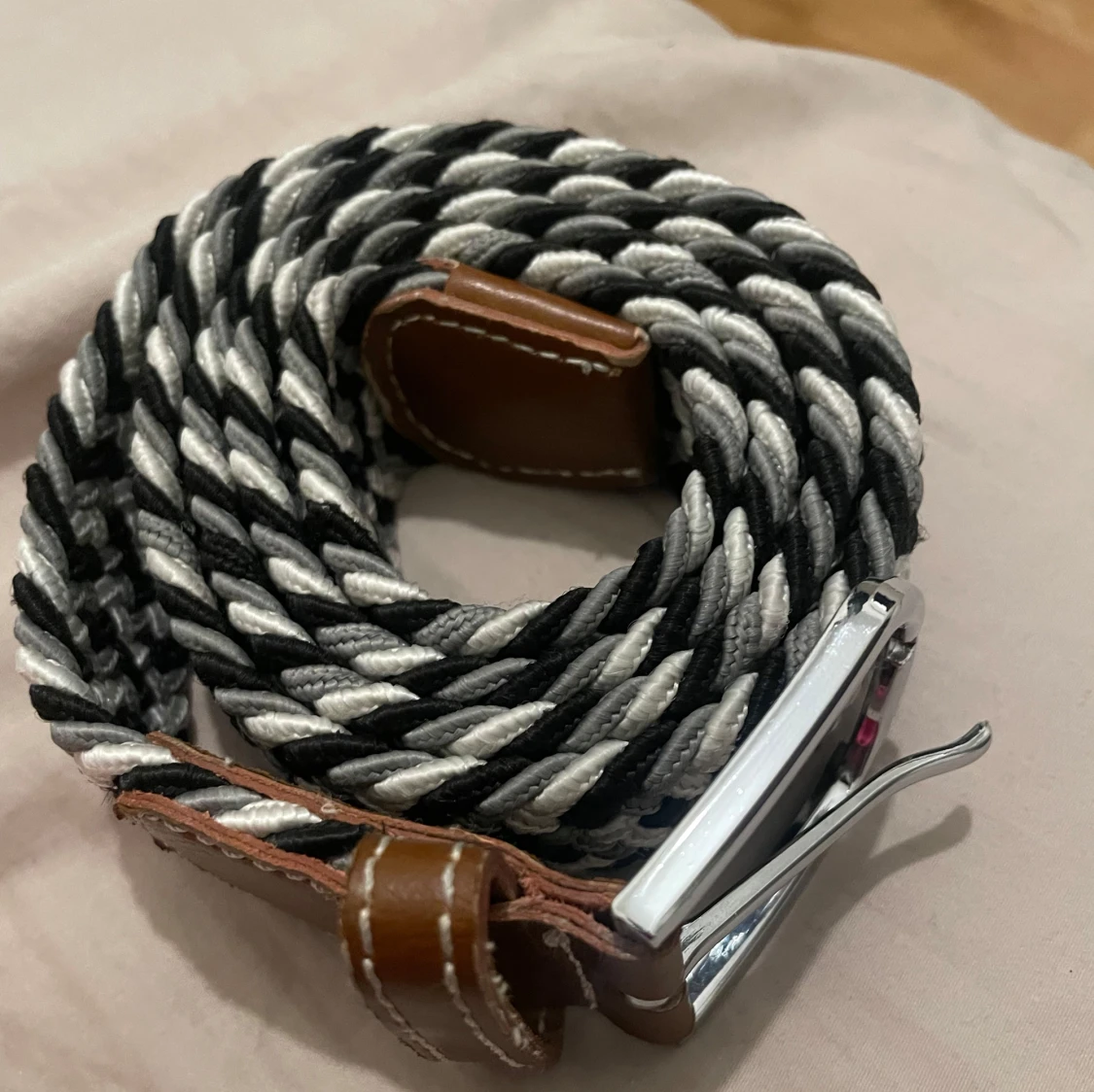 Säljer ett snyggt flätat bälte i svart och vitt passar perfekt till jeans eller chinos. Stl 110