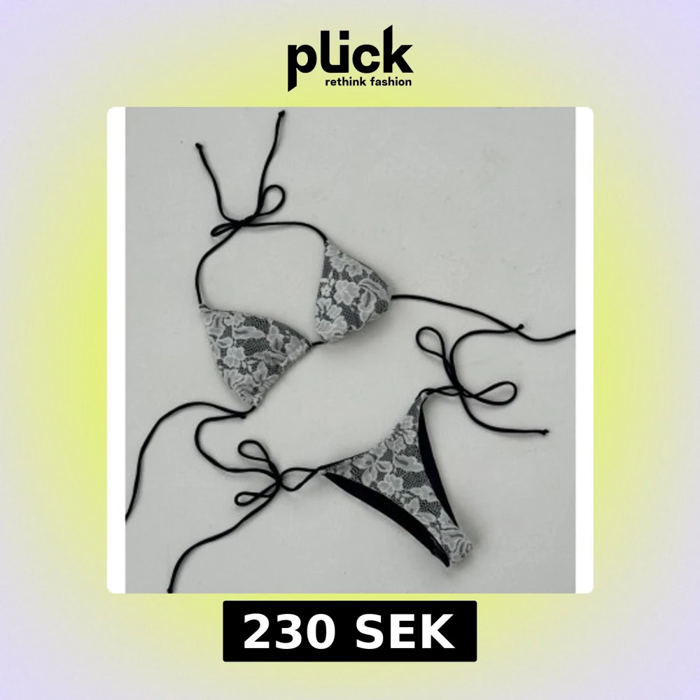 Snygg bikini från design by si med svart och vit spetsdetalj. Klassisk trekantsmodell med knyt både i rygg och vid höfter. Perfekt för sommardagar på stranden. Topp och trosa i matchande design. (Helt oanvänd säljer då den var för liten och försent att skicka tillbaka)