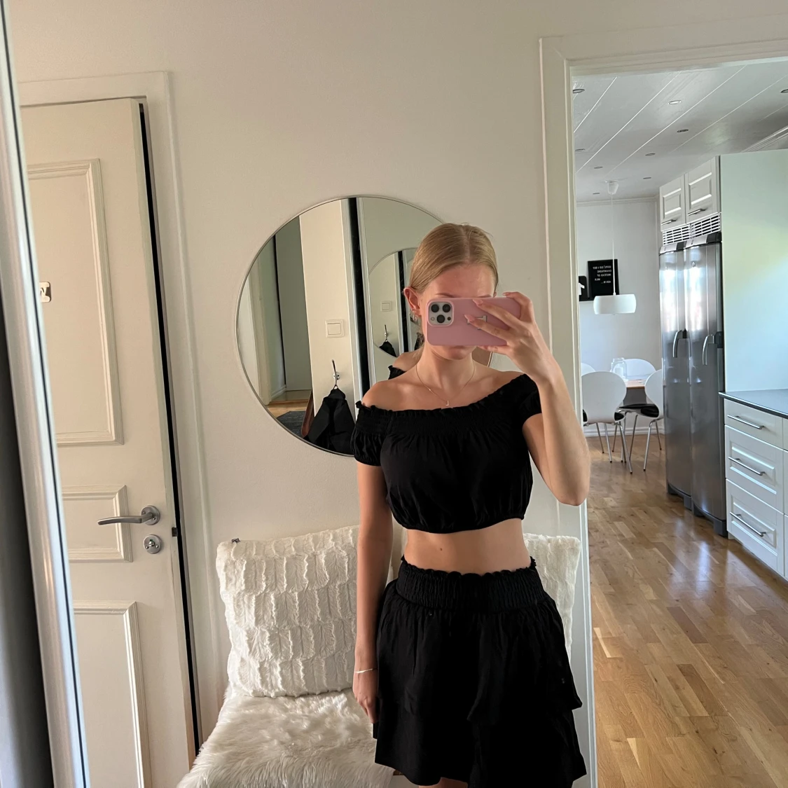 Säljer en snygg svart offshoulder topp med matchande kjol som är perfekt för sommaren. Toppen är croppad och plaggen har en elastisk passform som gör de både bekväma och stilrena. Perfekt för en dag på stan eller en sommarkväll med vänner.