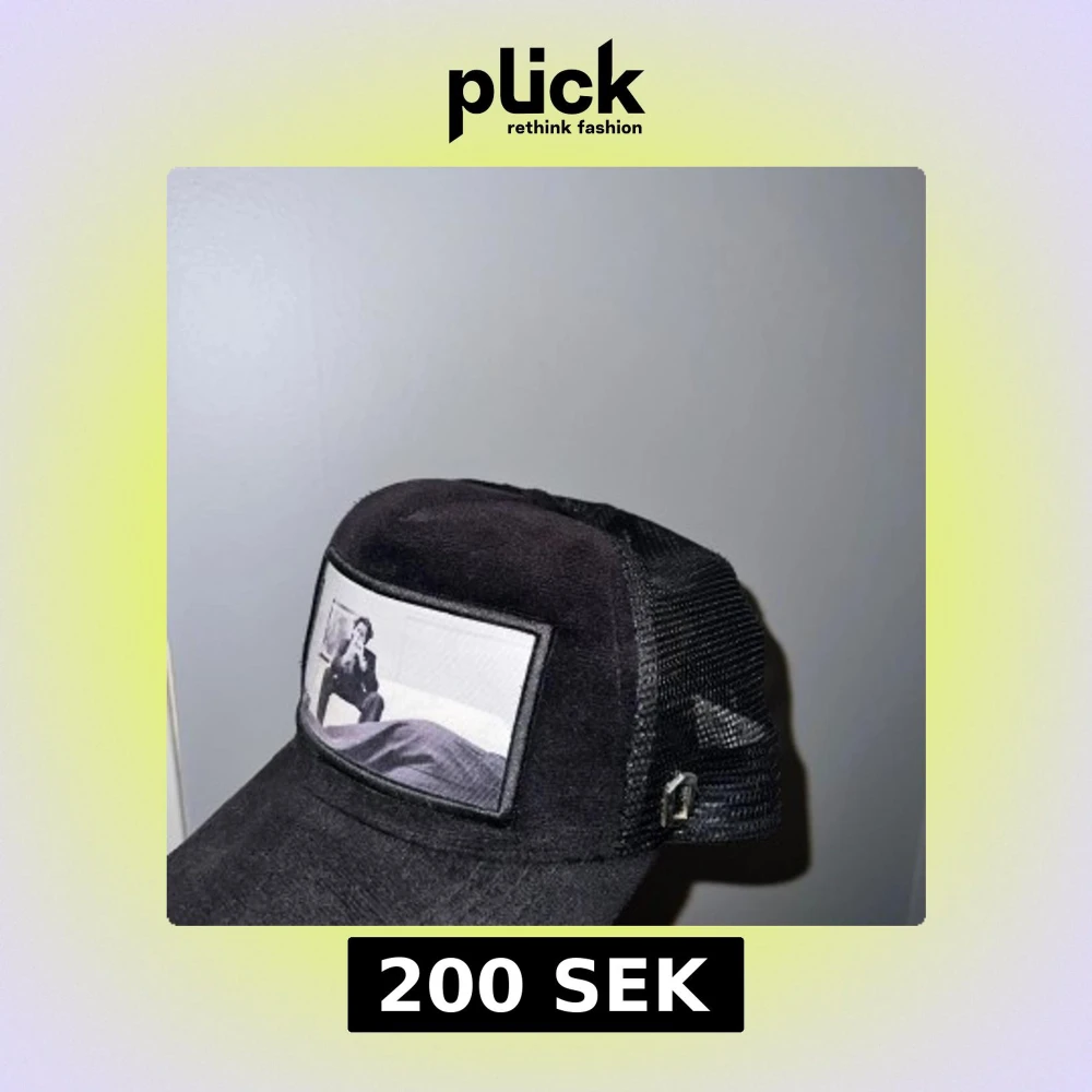 Säljer en svart keps från OneCap med mesh på sidorna och baksidan. Framtill finns ett stort svartvitt tryck med motiv av en person som sitter på en säng. Kepsen har justerbar storlek och cool streetstil.