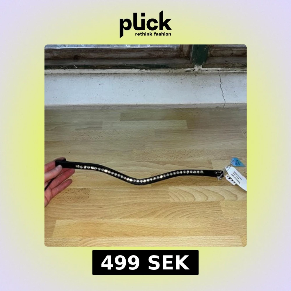 Snyggt svart pannband i skinn från Capone, dekorerat med en rad glittriga stenar. Storlek cob, helt nytt och aldrig använt. Liten skavank som fanns när jag köpte på ena sidan, se bilder. Nypris 799:-. 💖
