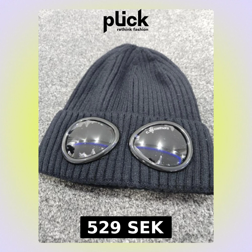 Säljer en svart ribbstickad mössa från C.P. Company med ikoniska glasögon-detaljer framtill. Mössan är tillverkad i mjuk ull och har en klassisk uppvikt kant. Perfekt för dig som vill ha en cool och unik accessoar.