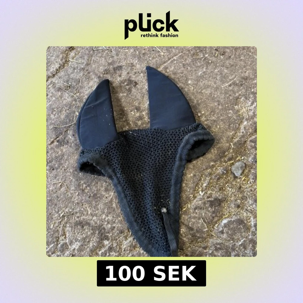 Svart ridhuva med långa, mjuka öron och virkad mesh över huvudet. Perfekt för att skydda hästens öron mot insekter under ridning. Klassisk och stilren design.