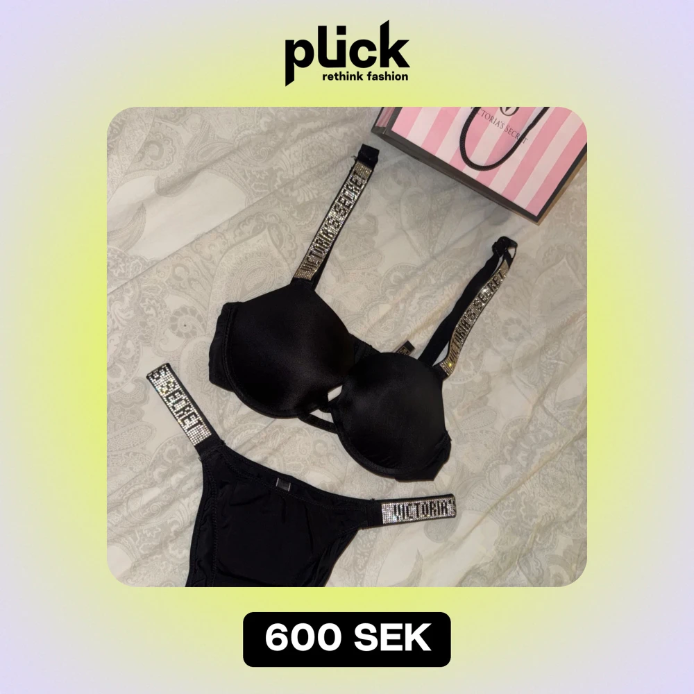 Snygg svart bikini set från Victoria's Secret med glittriga detaljer på axelbanden och midjan. Materialet känns lyxigt och bekvämt mot huden.