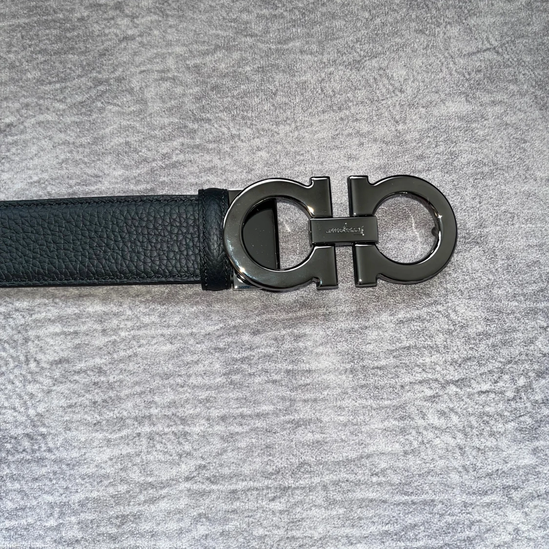 Säljer ett svart skärp från Salvatore Ferragamo i äkta skinn med en ikonisk dubbel Gancini-spänne i metall. Skärpet har en stilren och klassisk design med struktur i lädret och levereras med originalpåse. Perfekt accessoar för att lyfta din outfit.