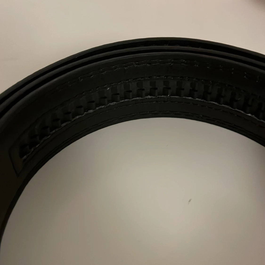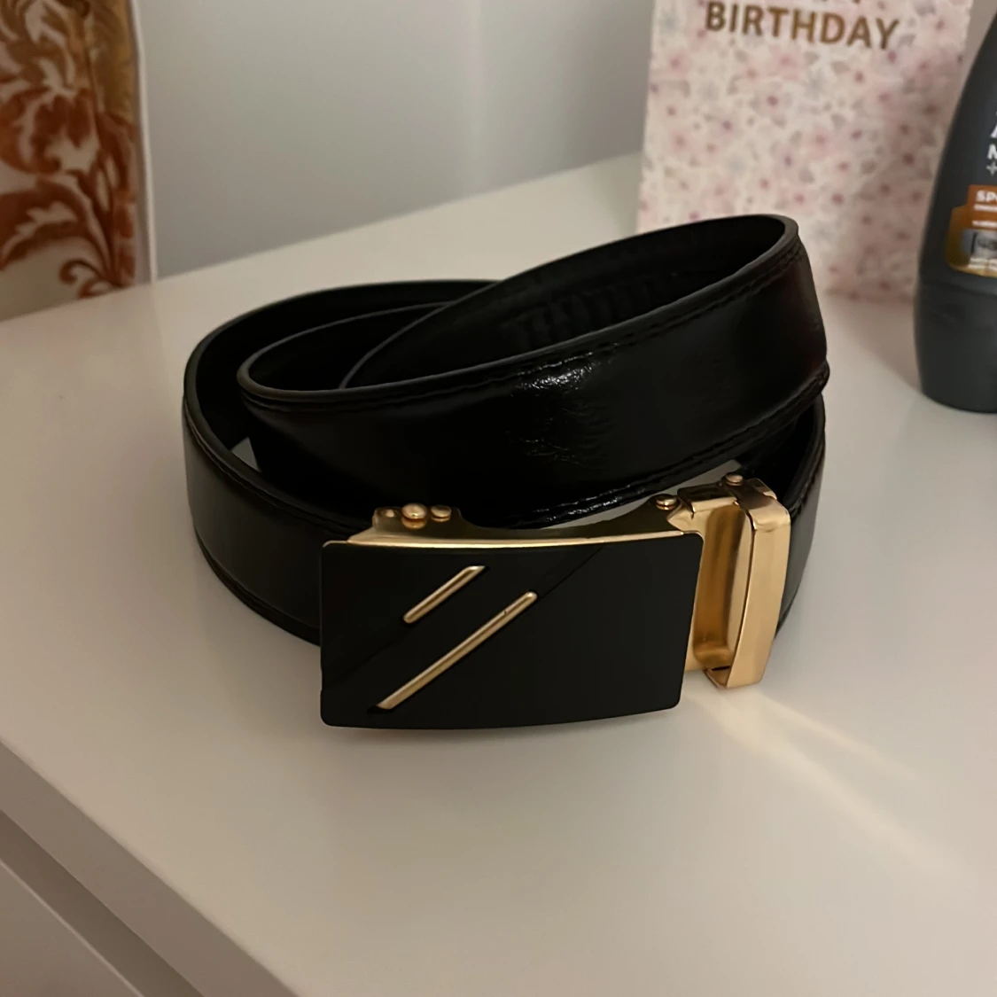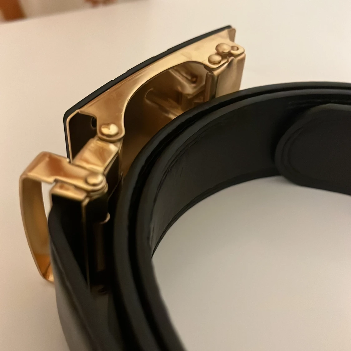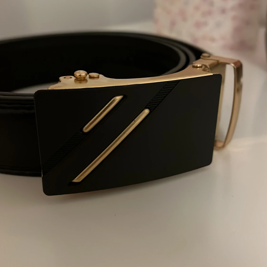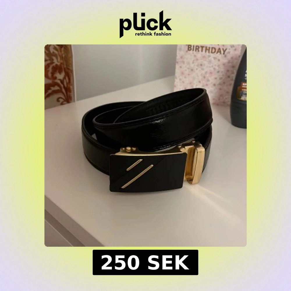 Snyggt svart bälte i skinn med ett stilrent, rektangulärt spänne i guldfärg och svarta detaljer. Spännet har två diagonala guldfärgade linjer som ger en modern vibe. Bältet har en slät yta och justerbar längd med smart låsmekanism.