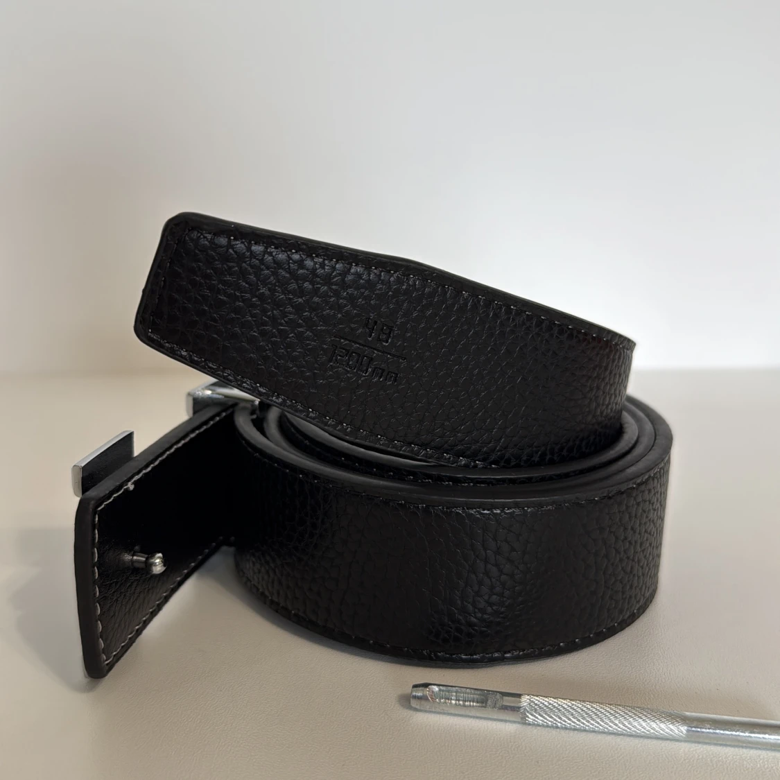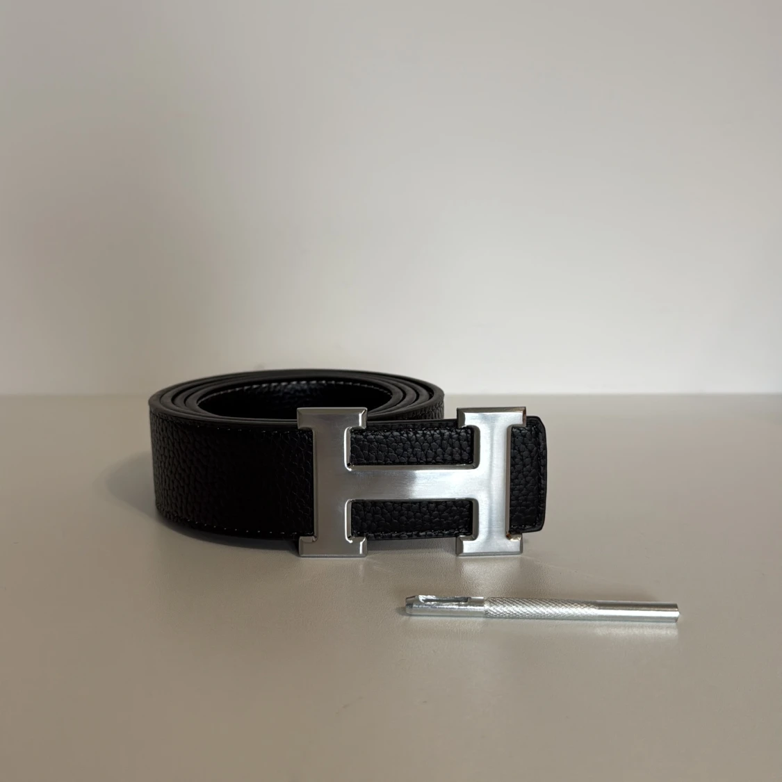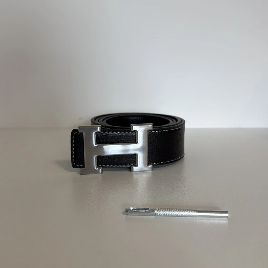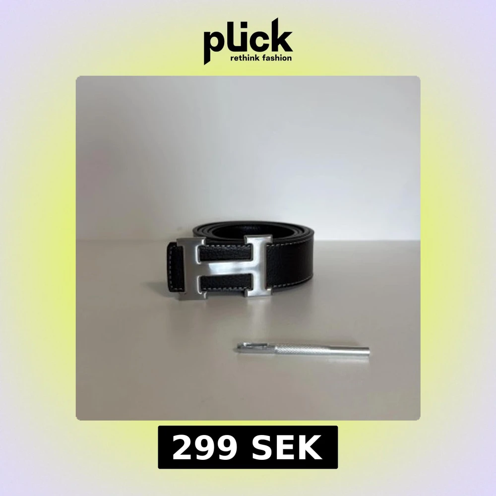 Snyggt svart bälte från H med ett stort, silvrigt H-format spänne. Bältet är gjort i präglat skinn med vita sömmar längs kanterna. Perfekt accessoar för att lyfta din outfit med en lyxig touch.